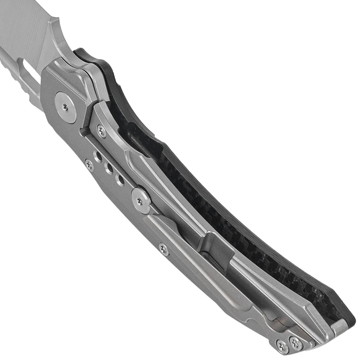 Rękojeść - po stronie prezentacyjnej kompozyt Carbon Fiber, praktycznie niezniszczalne tworzywo niewrażliwe na warunki atmosferyczne, odporne na chemikalia i uszkodzenia mechaniczne. Strona blokady to lity tytan 6AL4V. Fazowane krawędzie okładek eliminują ostre ranty dla wygody i poprawiają pewność uchwytu. Masywny tytanowy backspacer do którego przymocowano okładziny gwarantuje sztywność i wytrzymałość całej konstrukcji. Oś piwota ozdobiona logiem projektantów, Todd Knife and Tool. Jednopozycyjny, prawostronny tytanowy klips umożliwia przenoszenie noża w pozycji tip-up, czubkiem ostrza ku górze.