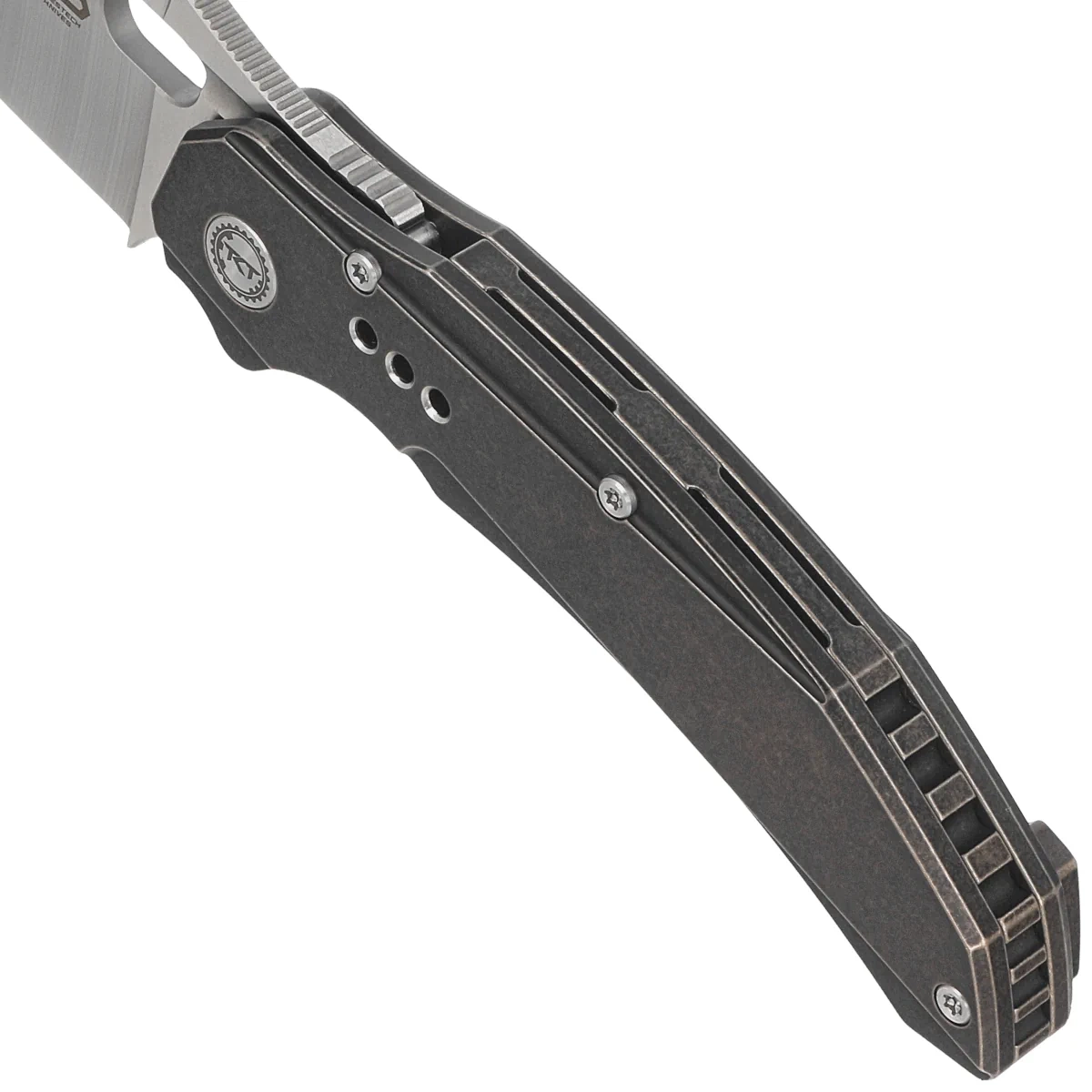 Głownia - szerokatypu Spear Point z eleganckim wykończeniem metodą Satin. Wydatny brzusiec wydłuża długość krawędzi tnącej w stosunku do długości klingi zbiegając się w kierunku ostrego jak igła czubka noża. Grubość klingi zapewnia wysoką wytrzymałość podczas gdy wysoki, płaski szlif daje doskonałą geometrię krawędzi tnącej oraz ekstremalną wydajność cięcia. Dodatkowym wzmocnieniem jest długie zbrocze. Ceramiczne łożyska kulkowe wspomagają otwarcie ostrza za pomocą szybkiej płetwy front flippera (index-finger front flipper). Nóź możemy również otworzyć przy użyciu otworu w klindze (thumb hole). Całość blokowana jest sprawdzoną i popularną blokadą frame lock ze stalową wkładką zabezpieczającą przed wycieraniem czoła blokady.