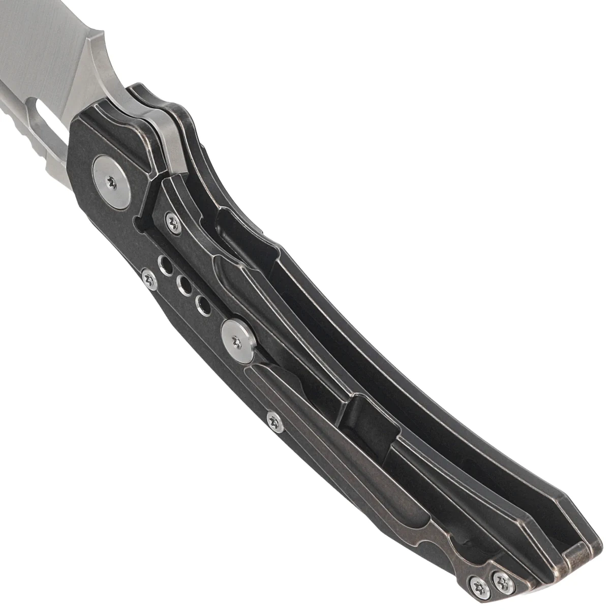 Rękojeść - to dwa kawałki litego tytanu 6AL4V. Fazowane krawędzie okładek eliminują ostre ranty dla wygody i poprawiają pewność uchwytu. Masywny tytanowy backspacer do którego przymocowano okładziny gwarantuje sztywność i wytrzymałość całej konstrukcji. Oś piwota ozdobiona logiem projektantów, Todd Knife and Tool. Jednopozycyjny, prawostronny tytanowy klips umożliwia przenoszenie noża w pozycji tip-up, czubkiem ostrza ku górze.