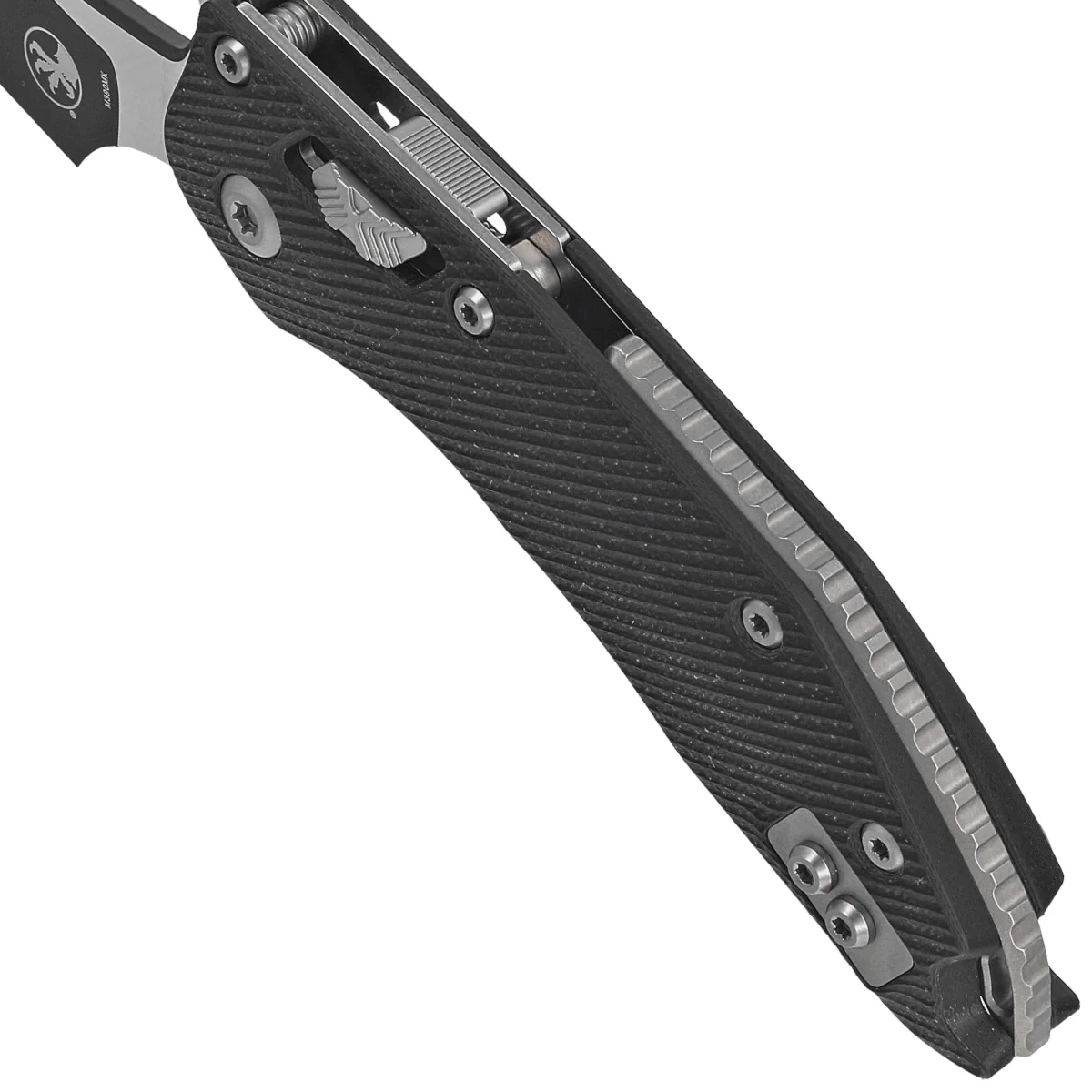Rękojeść - wykonana na frezarkach CNC z najwyższą precyzją, z kompozytu G-10, z głęboko frezowaną, trójwymiarową strukturą 3D Fluted. Szeroki suwak blokady z charakterystyczną dla firmy Microtech schodkową strukturą (X Button) zapewnia pewną i komfortową obsługę. Okładziny połączono solidnym, aluminiowym backspacerem. Dwustronny (prawa / lewa) klips umożliwia na dyskretne przenoszenie noża w pozycji tip-up. Wystający fragment backspacera z otworem na linkę, może również służyć za improwizowany zbijak do bicia szkła.