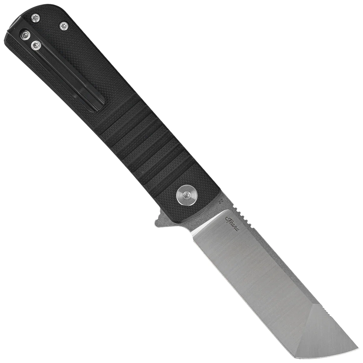Głownia - typu Tanto, z efektownym wykończeniem Two Tone, szlif satynowany, pozostała część ostrza wykończona metodą Stonewashed. Geometryczny brzusiec wydłuża długość krawędzi tnącej w stosunku do długości klingi zbiegając się w kierunku ostrego jak igła czubka noża. Grubość klingi zapewnia wysoką wytrzymałość podczas gdy wysoki, płaski szlif daje doskonałą geometrię krawędzi tnącej oraz ekstremalną wydajność cięcia. Łożyska kulkowe wspomagają otwarcie ostrza za pomocą szybkiej płetwy flippera (index-finger flipper), a po otwarciu pełniącej funkcję jelca. Fragment grzbietu klingi pokryto upper jimping, karbowanym oparciem pod kciuk ułatwiającym kontrolę nad nożem. Całość blokowana jest sprawdzoną i popularną blokadą liner lock.