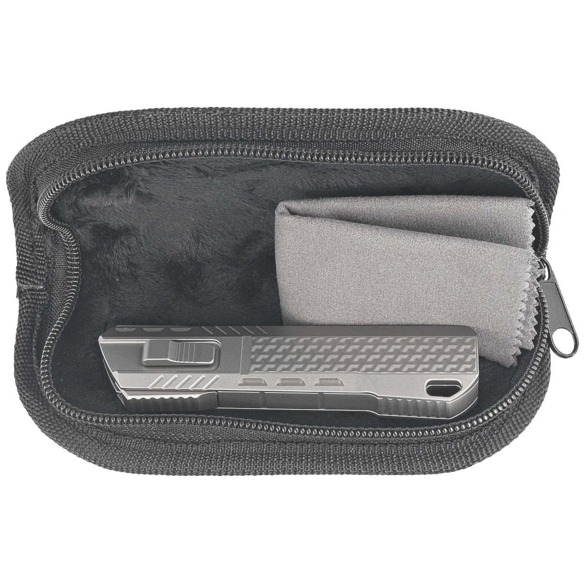 Rękojeść - wykonana na frezarkach CNC z tytanu, z trójwymiarową teksturą. Fazowane krawędzie okładek eliminują ostre ranty oraz poprawiają pewność uchwytu. Po prawej stronie kunsztowny suwak do wysuwania/wsuwania klingi. Jednopozycyjny tytanowy (prawa) klips deep carry umożliwia dyskretne przenoszenie noża w kieszeni w pozycji tip-down (czubkiem ostrza do dołu).