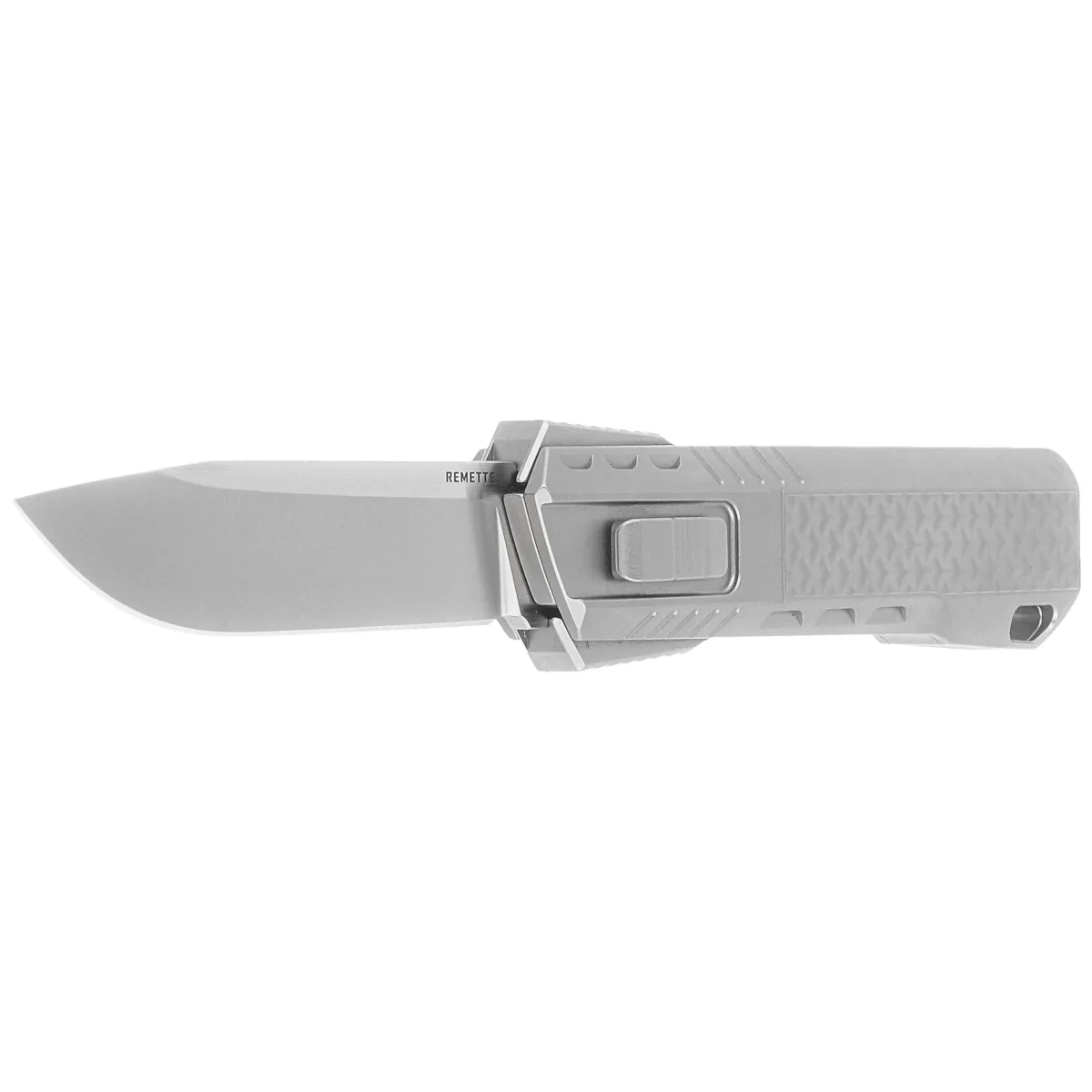 - RT-Sharp Leopard Gray Titanium, Hand Grinding Pearlescent kompaktowy folder EDC z młodej manufaktury Remette Knives. OTF z wysuwanym dzięki sile grawitacji ostrzem ze stali Böhler M390. Wygodna rękojeść z tytanu z nowatorskim systemem uwalniania ostrza.