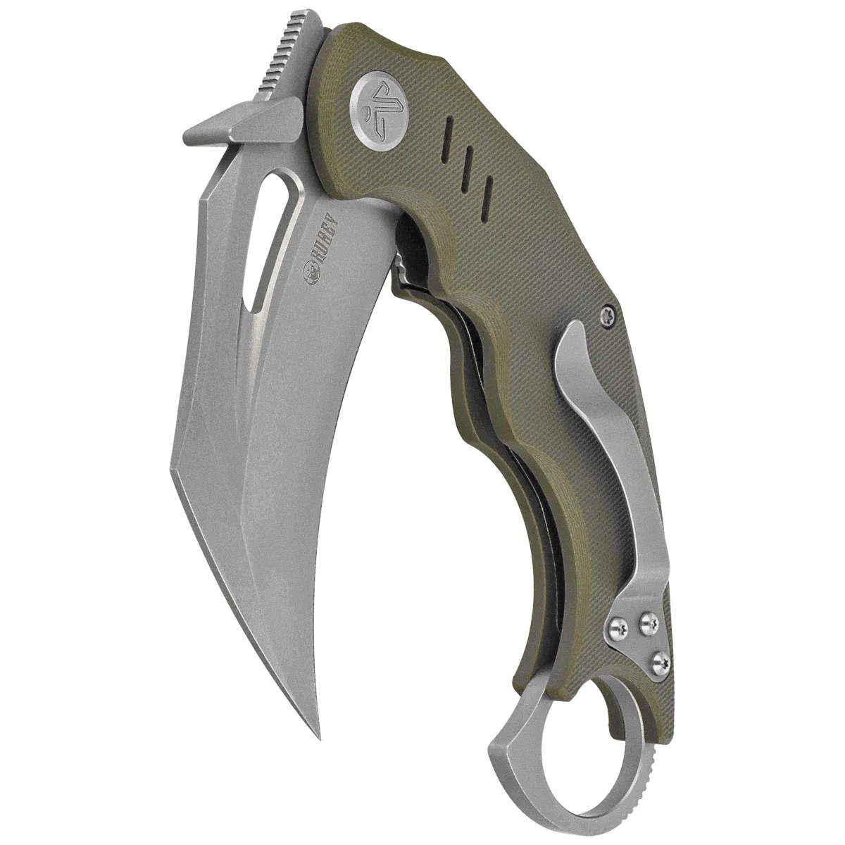 - Wrath Green G10, Beadblasted kompaktowy karambit projektu MUZI Design. Zakrzywiona głownia ze stali Sandvik 14C26N, profilowana rękojeść z kompozytu G10. Trzy sposoby otwierania, flipper, otwór na kciuk oraz szybkiego otwarcia o krawędź kieszeni.