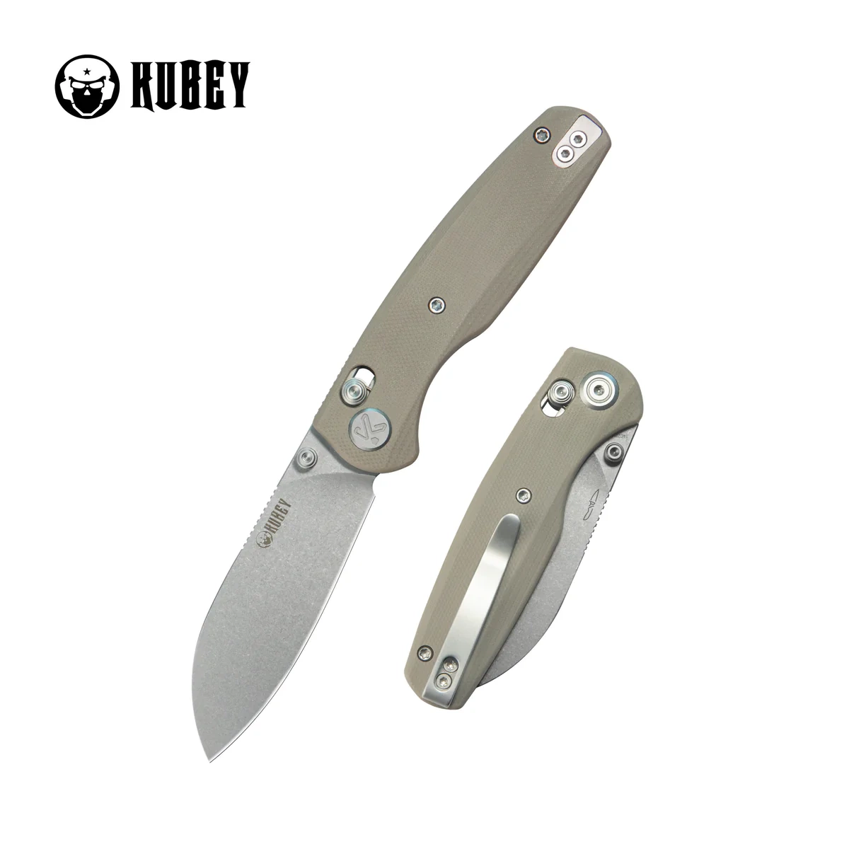 Rękojeść - to dwa kawałki kompozytu G10, materiału niezwykle wytrzymałego mechanicznie i praktycznie całkowicie odpornego na warunki atmosferyczne i działanie chemikaliów, teksturowane dla poprawienia pewności uchwytu, przykręcono do stalowej ramy noża. Fazowane krawędzie okładek eliminują ostre ranty dla wygody i poprawiają pewność uchwytu. Serio otworów w rękojeści dodaje wizualnej lekkości i odciąża nóż. Lekki backspacer zapewnia pożądaną sztywność i wytrzymałość projektu Prosta, pewna konstrukcja daje pewność wieloletniego użytkowania. Głębokie podcięcie na palec (fore finger groove) poprawia pewność uchwytu. Oś pivota zdobi stylizowane logo marki Kubey Knife. Dwupozycyjny (prawa/lewa) klips deep carry pozwala przenosić dyskretnie nóż w kieszeni w pozycji tip-up (czubkiem ostrza do góry).