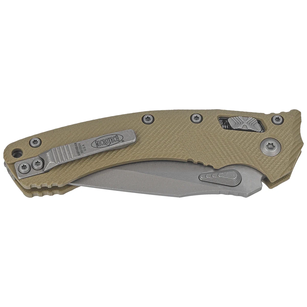 Rękojeść - wykonana z wytrzymałego kompozytu G10, dla lepszego uchwytu pokryta wyfrezowanymi liniami (Fluted). Szeroki suwak blokady z charakterystyczną dla firmy Microtech schodkową strukturą X. Obie okładziny zostały skręcone przy pomocy solidnego, backspacera. Dwustronny (prawa / lewa) tytanowy klips pozwala dyskretnie nosić nóż w pozycji tip-up. Nad klipsem lanyard hole, miejsce na linkę zabezpieczającą lub ozdobną.