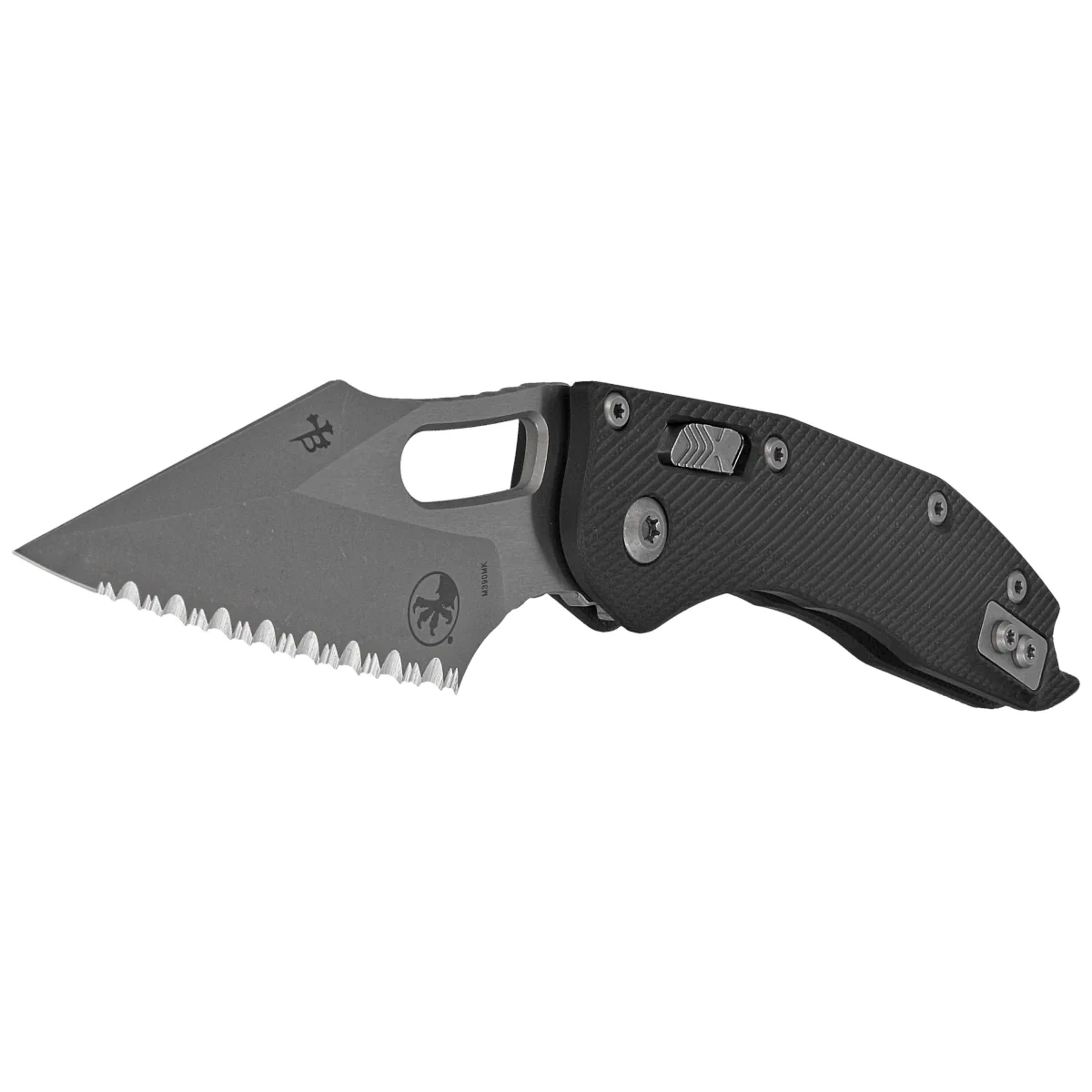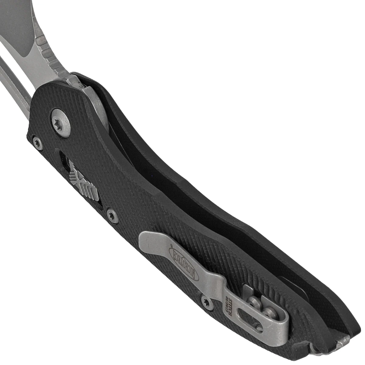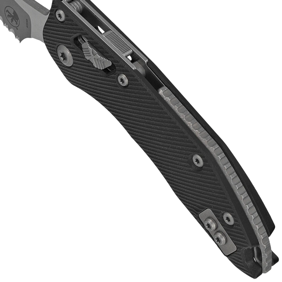 Rękojeść - wykonana na frezarkach CNC z doskonałą precyzją, z kompozytu G10, praktycznie niezniszczalnego tworzywa niewrażliwego na warunki atmosferyczne, odpornego na chemikalia i uszkodzenia mechaniczne, o głęboko frezowanej strukturze 3D Fluted. Szeroki suwak blokady z charakterystyczną dla firmy Microtech schodkową strukturą X. Obie okładziny zostały skręcone przy pomocy solidnego, aluminiowego backspacera. Dwustronny (prawa / lewa) klips pozwala dyskretnie nosić nóż w pozycji tip-up. Wystający fragment backspacera w którym znajduje się otwór na linkę, może również służyć za improwizowany zbijak do szkła.