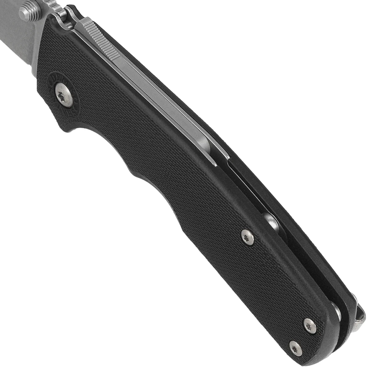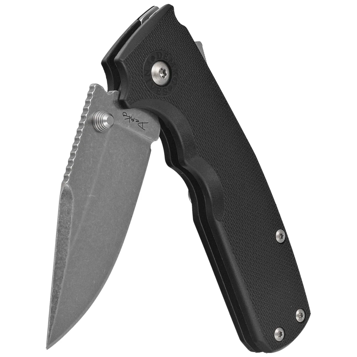 Rękojeść - okładziny z kompozytu GRN (Glass Reinforced Nylon), lekkiego i wytrzymałego tworzywa niewrażliwego na warunki atmosferyczne, odpornego na chemikalia i uszkodzenia mechaniczne. Fazowane krawędzie okładek eliminują ostre ranty a charakterystyczne teksturowanie powierzchni poprawia pewność uchwytu. Dwupozycyjny (prawa/lewa) klips umożliwia przenoszenie noża w pozycji tip-up, czubkiem ostrza ku górze.