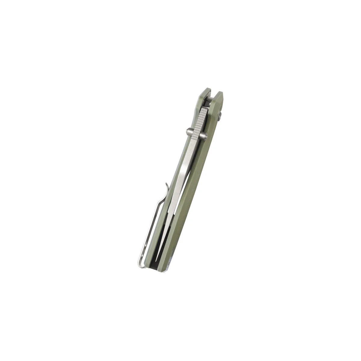 Rękojeść - okładziny z kompozytu G10, materiału niezwykle wytrzymałego mechanicznie i praktycznie całkowicie odpornego na warunki atmosferyczne i działanie chemikaliów, teksturowane dla poprawienia pewności uchwytu, przykręcono do stalowej ramy noża. Masywny backspacer zapewnia pożądaną sztywność. Prosta, solidna konstrukcja daje pewność wieloletniego użytkowania. Oś pivota zdobi stylizowane logo producenta. Dwupozycyjny (prawa/lewa) metalowy klips deep carry pozwala przenosić dyskretnie nóż w kieszeni w pozycji tip-up (czubkiem ostrza do góry). W zagłębieniu backspacera miejsce na zamocowanie linki zabezpieczającej lub ozdobnej.