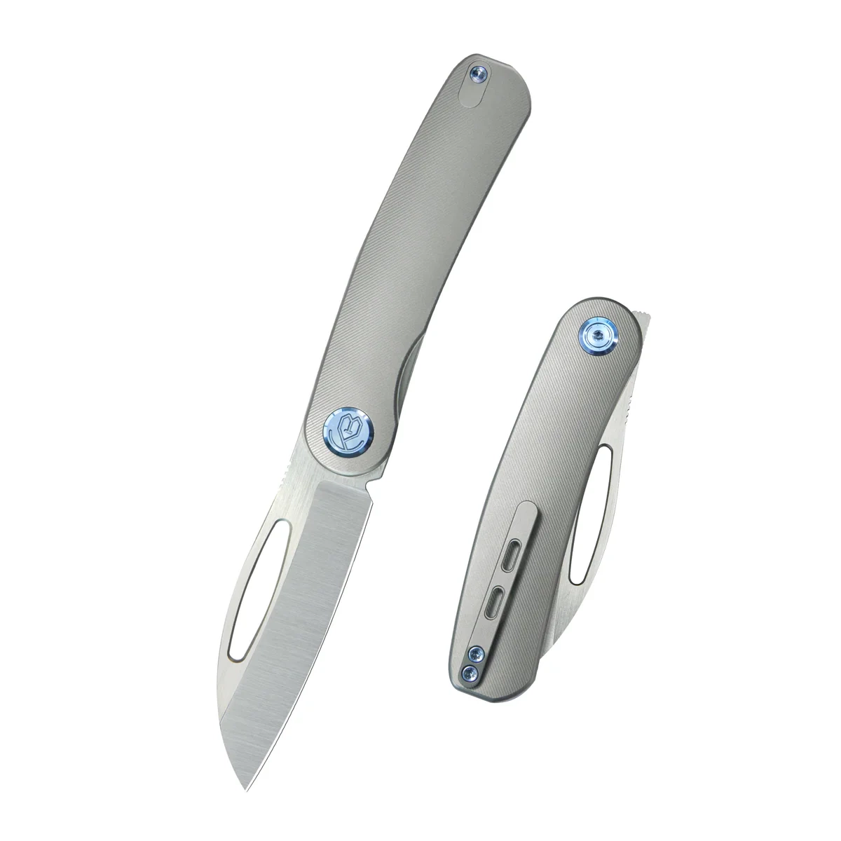 Rękojeść - profilowane okładziny z tytanu 6AL4V, mikrofrezowanego drobną teksturą. Całość skręcona do solidnego backspacera, również wykonanego z tytanu. Prosta, solidna konstrukcja daje pewność wieloletniego użytkowania. Oś pivota zdobi nakładka z tytanu (Pivot Cap) w kontrastowym kolorze. Dwupozycyjny (prawa/lewa) tytanowy klips deep carry pozwala przenosić dyskretnie nóż w kieszeni w pozycji tip-up (czubkiem ostrza do góry). Podcięcie na palec (fore finger groove) poprawia pewność uchwytu i tworzy mini-gardę zapobiegając ześlizgnięciu się dłoni na ostrze.