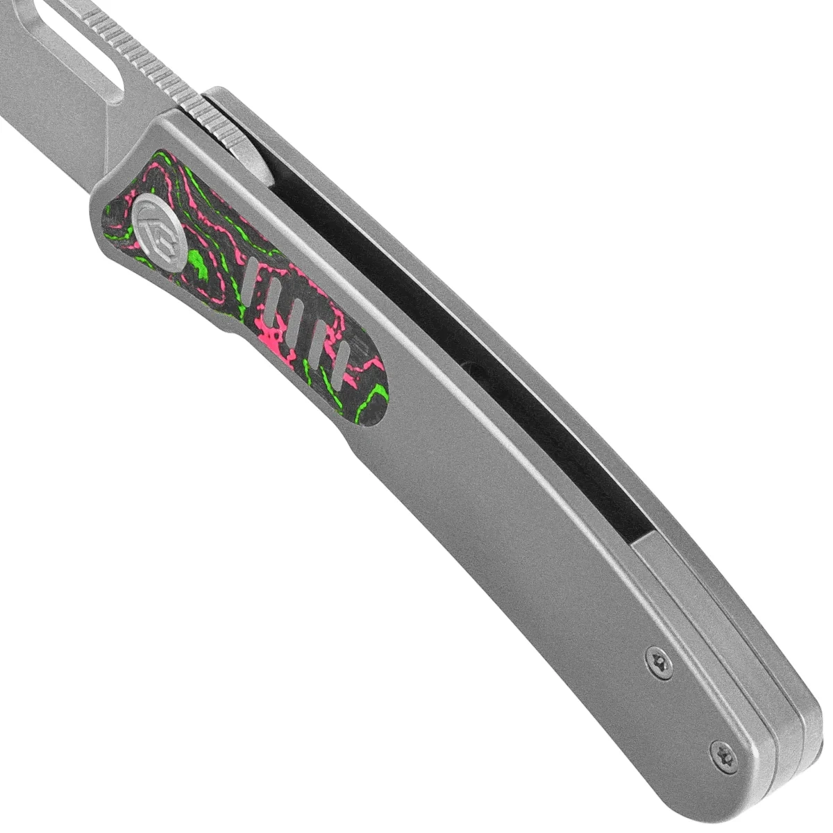 Rękojeść - z tytanu 6AL4V, materiału niezwykle wytrzymałego mechanicznie i praktycznie całkowicie odpornego na warunki atmosferyczne i działanie chemikaliów, z perfekcyjnie wpasowanymi wkładkami z kompozyty Watermelon Sugar Camocarbon. Całość skręcona do solidnego backspacera, również wykonanego z tytanu 6AL4V. Prosta, solidna konstrukcja daje pewność wieloletniego użytkowania. Jednopozycyjny (prawa) tytanowy klips deep carry pozwala przenosić dyskretnie nóż w kieszeni w pozycji tip-up (czubkiem ostrza do góry).