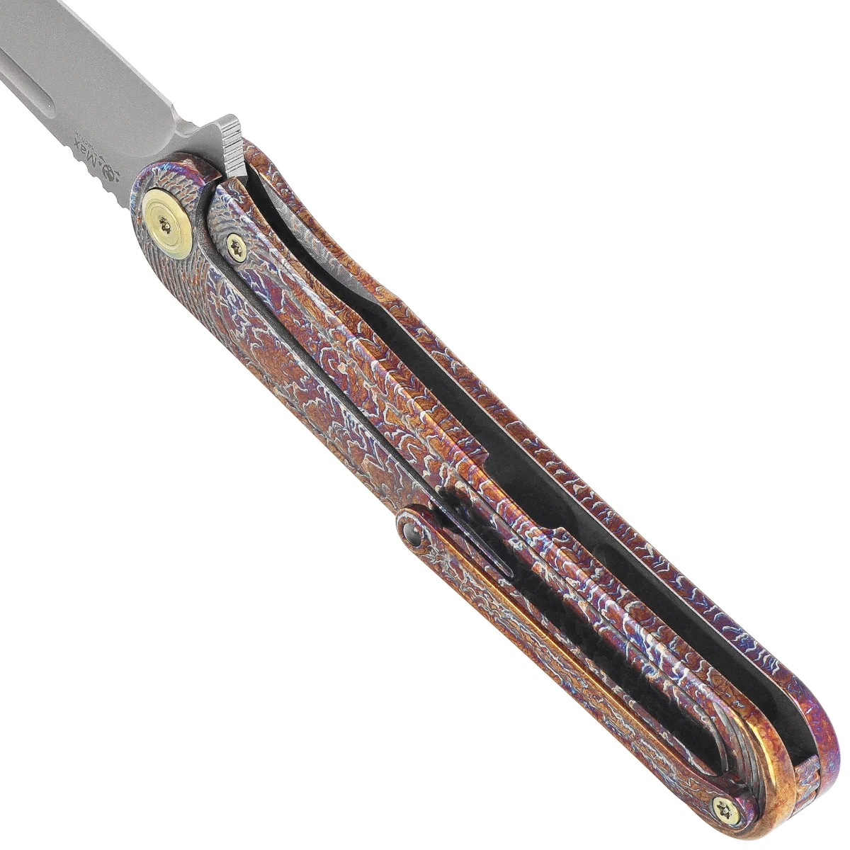 Rękojeść - profilowane okładziny z tytanu 6AL4V barwionego płomieniowo. Całość skręcona do solidnego backspacera, również wykonanego z tytanu. Prosta, solidna konstrukcja daje pewność wieloletniego użytkowania. Oś pivota zdobi nakładka z tytanu (Pivot Cap) w kontrastowym kolorze. Jednopozycyjny (prawa) tytanowy klips deep carry pozwala przenosić dyskretnie nóż w kieszeni w pozycji tip-up (czubkiem ostrza do góry). W tylnej części backspacera ukryte miejsce do przewleczenia linki zabezpieczającej lub ozdobnej.