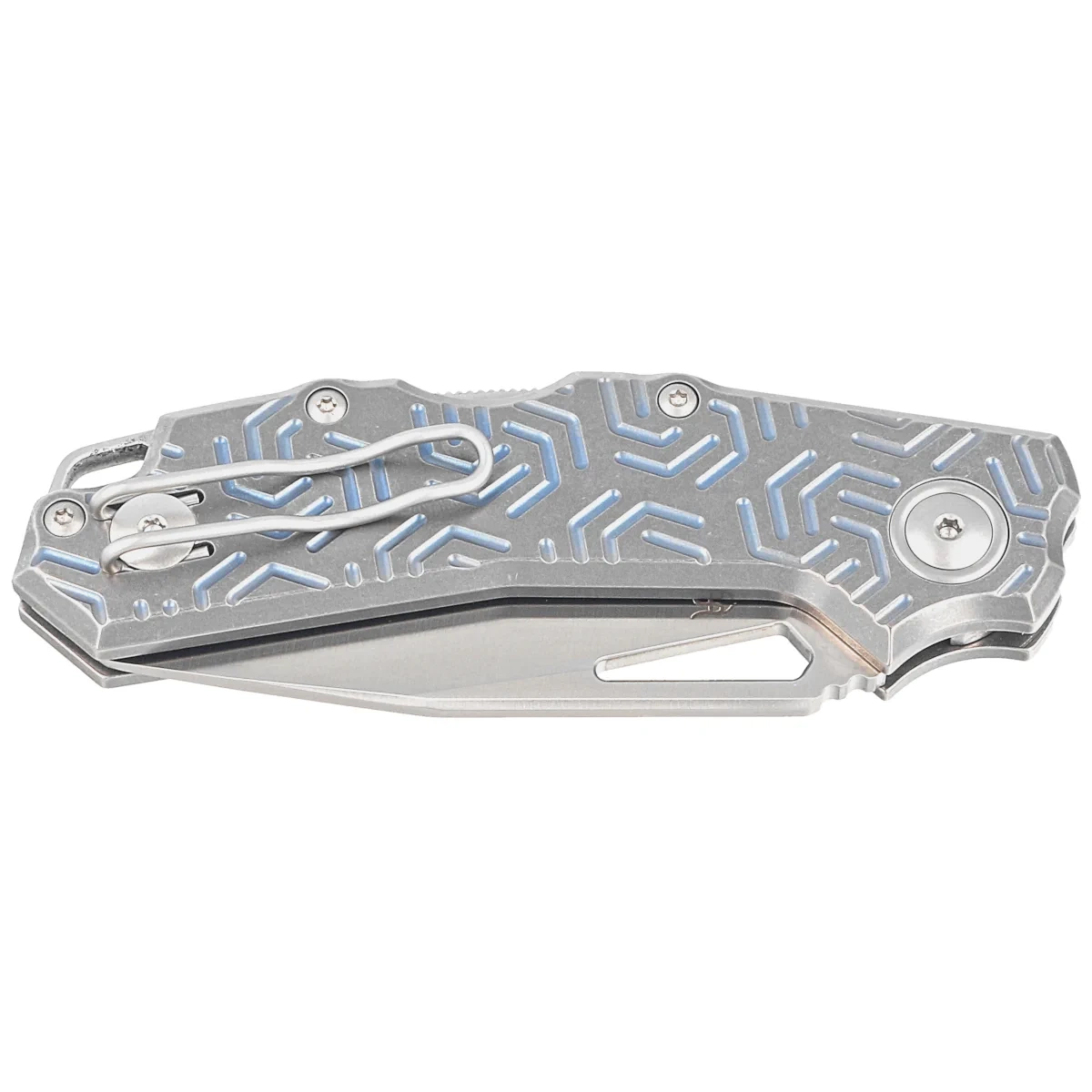 Alfa Gray/Blue Titanium, Satin, to wyrafinowane dzieło sztuki użytkowej, zaprojektowane przez renomowanego projektanta Simone Tonolliego. Głownia o profilu sheepsfoot wykonana z najwyższej jakości stali CPM MagnaCut, znanej z wyjątkowej odporności na korozję i możliwości wysokiego hartowania, co zapewnia długotrwałą ostrość krawędzi tnącej. Rękojeść z tytanu o geometrycznej teksturze charakteryzuje się lekkością i wytrzymałością, oferując pewny i komfortowy chwyt. Solidna blokada back lock gwarantuje bezpieczeństwo podczas użytkowania, eliminując ryzyko przypadkowego zamknięcia ostrza. Precyzyjne wykonanie oraz zastosowanie zaawansowanych materiałów czynią z tego noża niezawodne narzędzie, idealne zarówno do codziennych zadań, jak i wymagających zastosowań. Alfa łączy w sobie elegancję z funkcjonalnością, spełniając oczekiwania nawet najbardziej wymagających użytkowników.