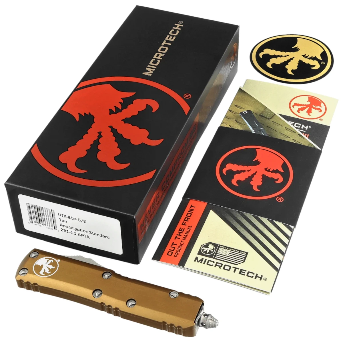 - UTX-85 S/E Tan Aluminium, Apocalyptic to kompaktowy nóż automatyczny OTF z serii UTX-85. Zaprojektowany do zastosowań EDC, zachowuje wszystkie zalety większych modeli. Pracujący w trybie D/A, wyposażony w szybki mechanizm wysuwający ostrze.