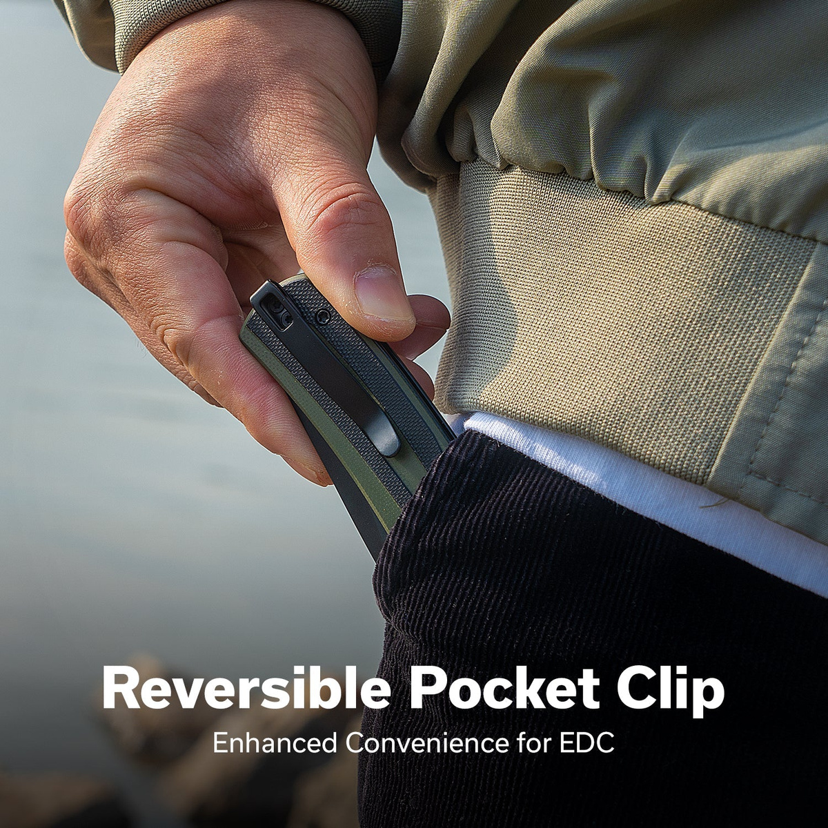 Rękojeść - wykonana z dwukolorowego kompozytu G10, praktycznie niezniszczalnego tworzywa, niewrażliwego na warunki atmosferyczne, odpornego na chemikalia i uszkodzenia mechaniczne. Fazowane krawędzie okładek eliminują ostre krawędzie dla wygody, uchwytu. Otwarta konstrukcja tzw. open-backed mocowana stalowymi tulejami dystansowymi redukuję wagę oraz ułatwia czyszczenie. Wykonane z przodu podcięcie na palec (fore finger groove) poprawia pewność uchwytu. Dwupozycyjny, prawo/lewostronny klips deep carry pozwala przenosić dyskretnie nóż w kieszeni w pozycji tip-up (czubkiem ostrza ku górze).