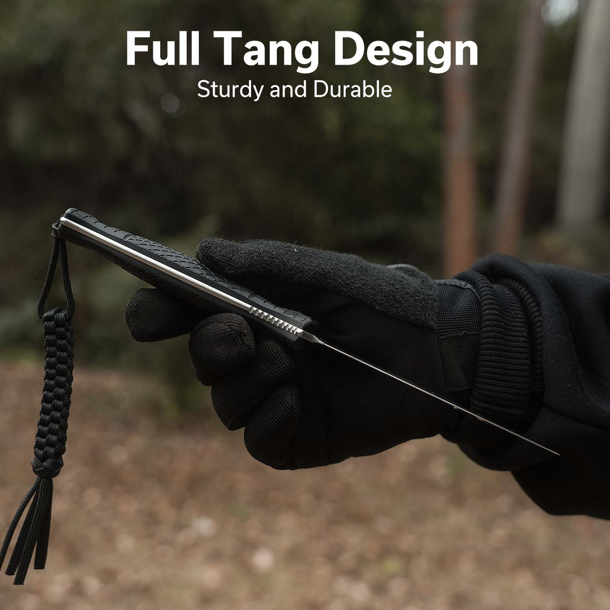 Rękojeść - okładziny z szorstkiego kompozytu G10, tworzywa niewrażliwego na warunki atmosferyczne, odpornego na chemikalia i uszkodzenia mechaniczne, które zostały przykręcone bezpośrednio do tanga. Profilowany kształt głębokie moletowanie zapewnia wygodny, pewny uchwyt również wilgotnymi dłońmi. Podcięcie na palec (fore finger groove) poprawia pewność uchwytu i zabezpiecza przed zsunięciem się dłoni na ostrze. Otwór na linkę ozdobną lub zabezpieczającą (smycz z plecionego paracordu dołączona do noża).