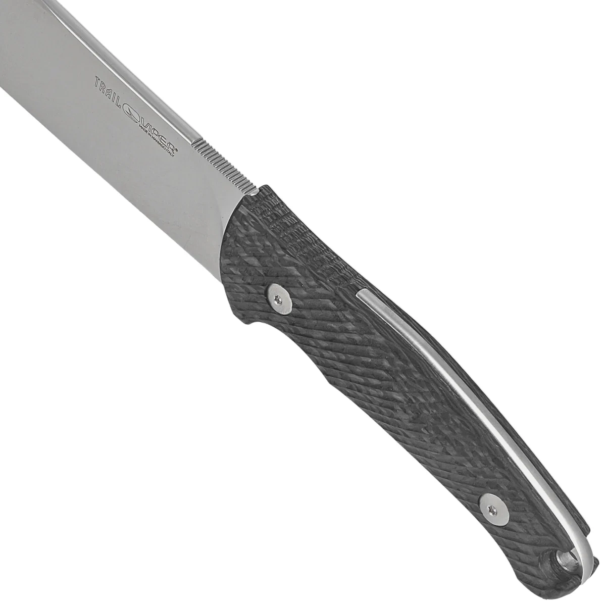 - Trail Black Carbon Fiber, Satin, duży nóż outdoorowy projektu Jensa Ansø, znanego duńskiego makera. Masywna głownia ze stali nierdzewnej Böhler N690Co, wygodna rękojeść z kompozytu Carbon Fiber. W komplecie klasyczna, skórzana pochwa mocowana do pasa.