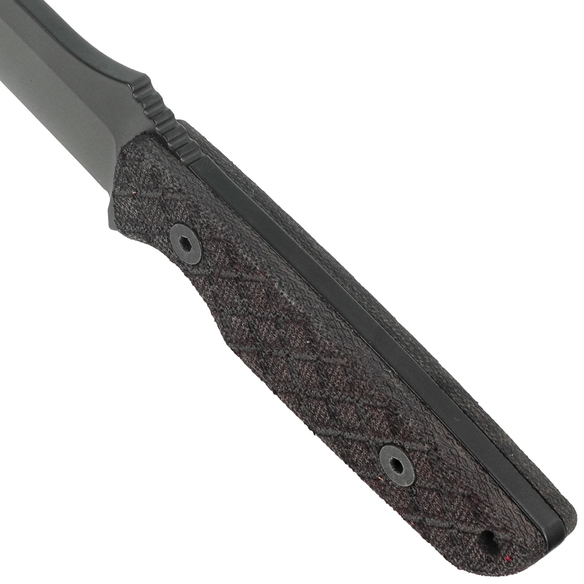 Rękojeść - okładziny z kompozytu Canvas Micarta, praktycznie niezniszczalnego tworzywa niewrażliwego na warunki atmosferyczne, odpornego na chemikalia i uszkodzenia mechaniczne. Profilowany kształt i precyzyjne teksturowanie zapewnia wygodny, pewny uchwyt również wilgotnymi dłońmi. Wykonane z przodu podcięcie na palce (fore finger groove) dla poprawienia pewności uchwytu. Rozszerzenie w przedniej części tworzy mini gardę zapobiegającą przypadkowemu zsunięciu się dłoni na ostrze.