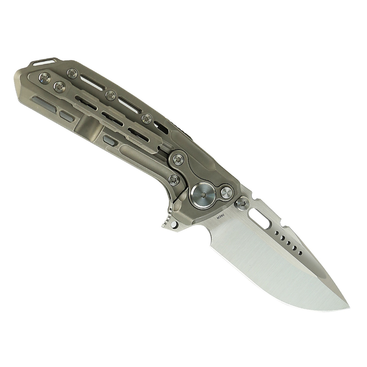 Rękojeść - z litego tytanu 6AL4V, perfekcyjnie wyfrezowana na obrabiarkach numerycznych CNC. Konturowanie okładek eliminuje ostre krawędzie, a ażurowana powierzchnia poprawia pewność chwytu. Tylko nieliczne firmy są w stanie wykonać rękojeść z tak nieprawdopodobną dokładnością! Okładziny połączono ze sobą przy pomocy tytanowego backspacera. Klips jednopozycyjny (prawa), z tytanu, umożliwia przenoszenie noża w pozycji tip-up. Na grzbiecie suwak zwalniania dodatkowej blokady w postaci dwóch stalowych walców umieszczonych nad osią pivota. Blokada działa również, gdy nóż jest zamknięty, zapobiegając przypadkowemu otwarciu. Wystający fragment backspacera może być używany jako improwizowany zbijak do szyb, posiada również otwór na linkę zabezpieczająca lub ozdobną.