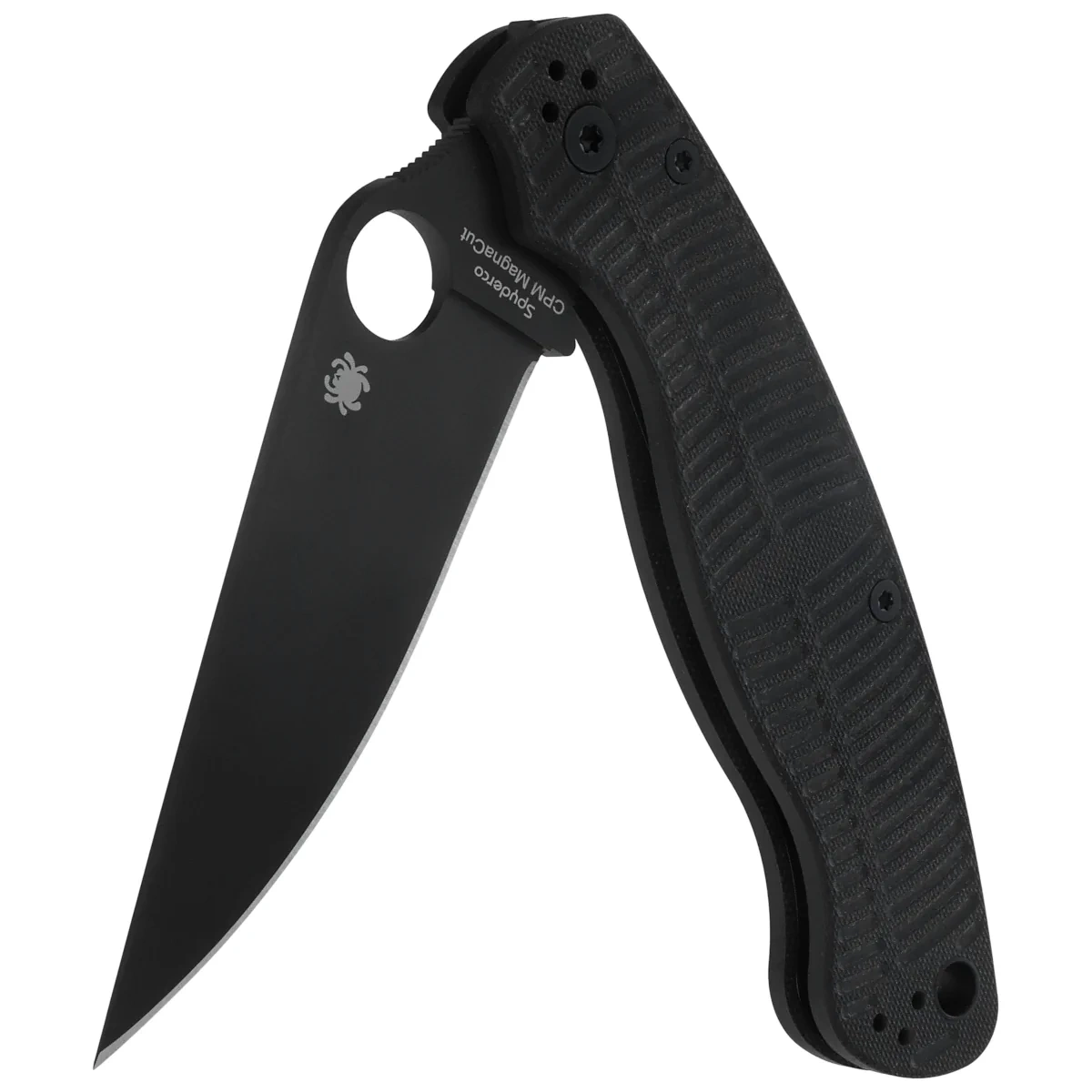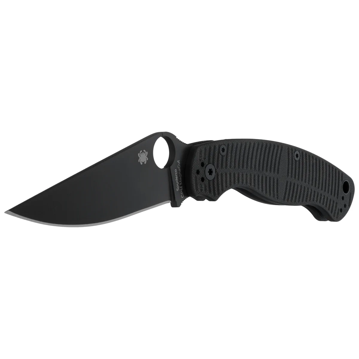 Głownia - zmodyfikowany profil Clip Point z wycięciem SpyderHole (patent Spyderco) umożliwiający szybkie otwarcie noża również w rękawicy, powiększona rampa pod kciuk z nacięciami (spine jimping), który pomaga kontrolować duże ostrze. Index Finger Choil (karbowane profilowane podcięcie pod palec wskazujący między rękojeścią a krawędzią tnącą), zapobiega przesuwaniu się foldera w dłoni podczas wykonywania mocnych cięć. Ostrze gładkie Plain w połączeniu z pełnym, płaskim szlifem (Full Flat Grind) daje doskonałą geometrię krawędzi tnącej oraz ekstremalną wydajność cięcia. W całości pokryta czarną powłoką DLC.