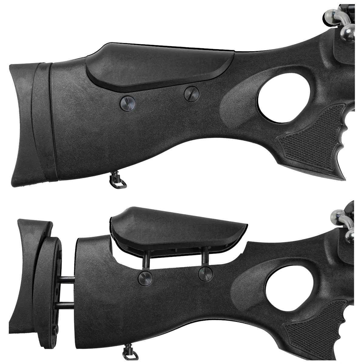 Osada - z otworem na kciuk TH (ThumbHole) wykonana z wytrzymałego odpornego na uszkodzenia mechaniczne polimeru. Wstawki z miękkiej gumy na środkowej części łoża zapewniają pewny chwyt również mokrymi dłońmi. Profilowana poduszka policzkowa na kolbie typu Monte Carlo ułatwia złożenie się do strzału jak i celowanie. Kolba przystosowana dla osób prawo i leworęcznych. Gumowa stopka absorbująca energię po oddanym strzale. Konstrukcja kolby umożliwia regulację wysokości baki za pomocą śrub. Na spodzie chwytu osady dwa gniazda (porty) na dodatkowe magazynki.