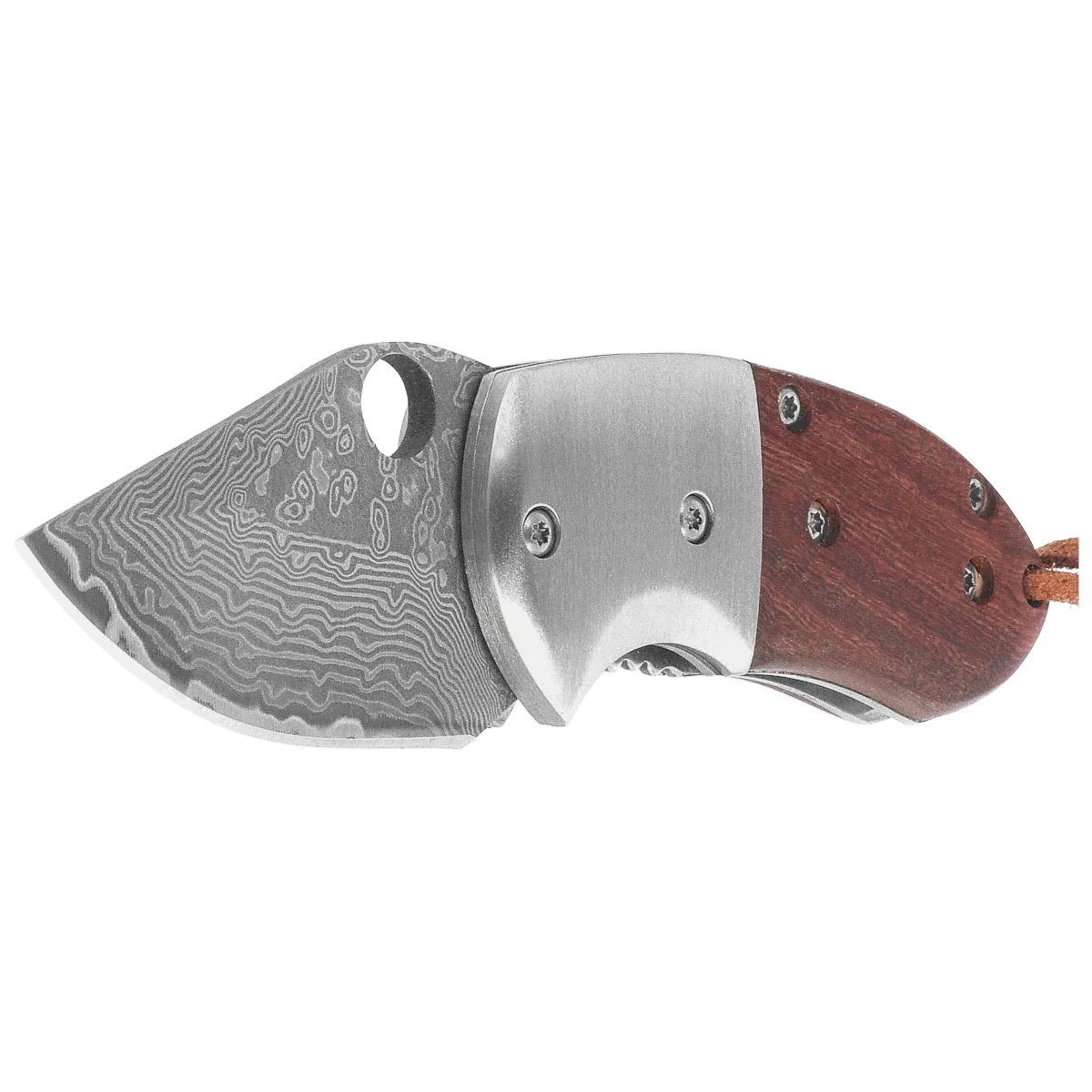 Rękojeść - z naturalnego drewna, którego subtelna faktura i barwa wprowadzają element rzemieślniczego stylu. Gładkie, zaokrąglone krawędzie zapewniają wygodny chwyt, a precyzyjne spasowanie z korpusem stalowym gwarantuje stabilność konstrukcji. Brak klipsa sprzyja minimalistycznej estetyce, a skórzany rzemyk z metalowym pierścieniem umożliwia szybkie mocowanie do plecaka lub zestawu EDC. Kompaktowe wymiary i staranna obróbka sprawiają, że rękojeść idealnie dopełnia głownię z damastu – tworząc nóż składany, który łączy w sobie funkcjonalność, trwałość i klasyczną elegancję.