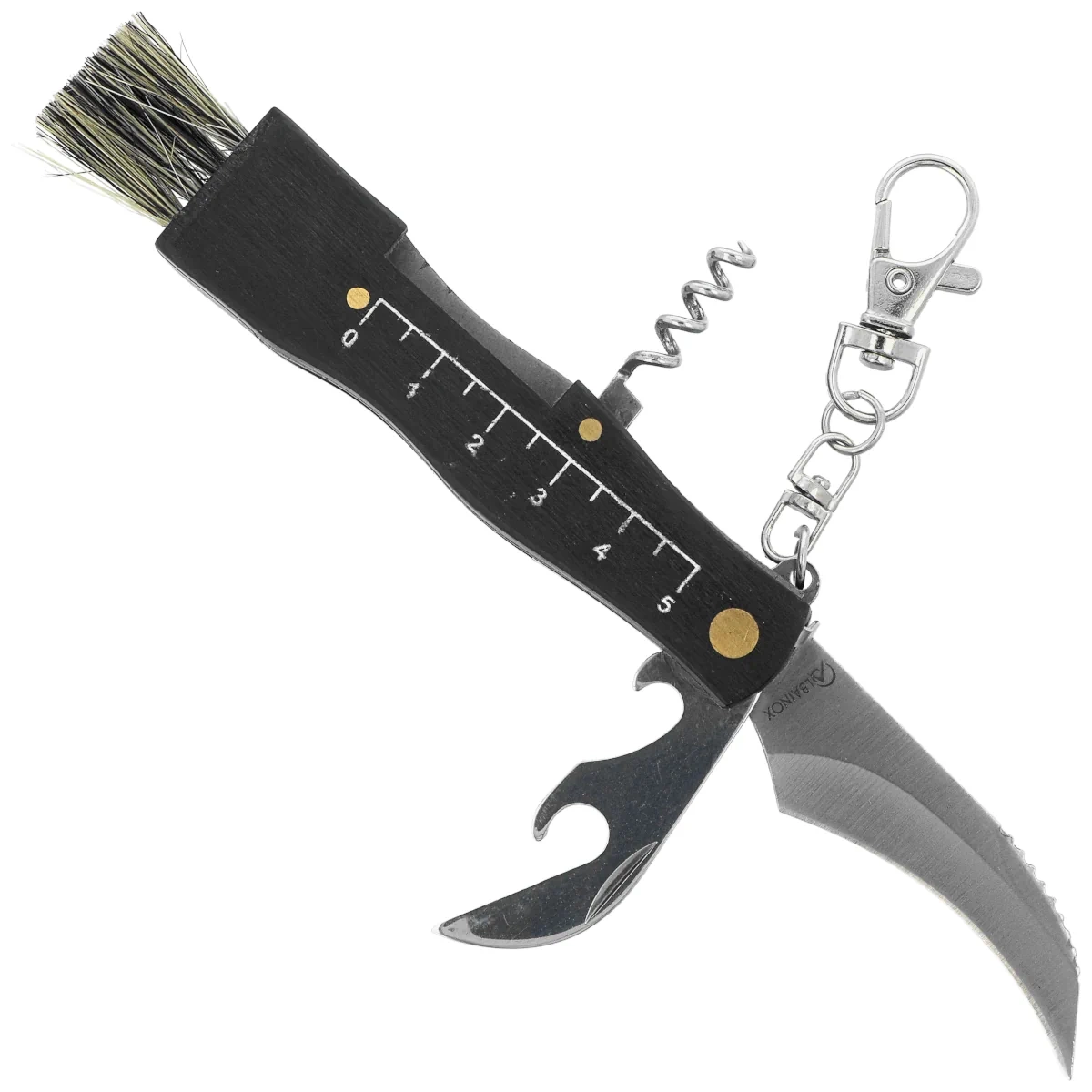 - Setera Multi Madera Wood, Satin wielofunkcyjny nóż grzybiarski od Martinez Albainox z zakrzywioną głownią ze stali 3Cr13MoV, rękojeścią z drewna, szczoteczką, pęsetą, otwieraczem do puszek i butelek, korkociągiem, kółkiem na klucze. Praktyczny i przydatny