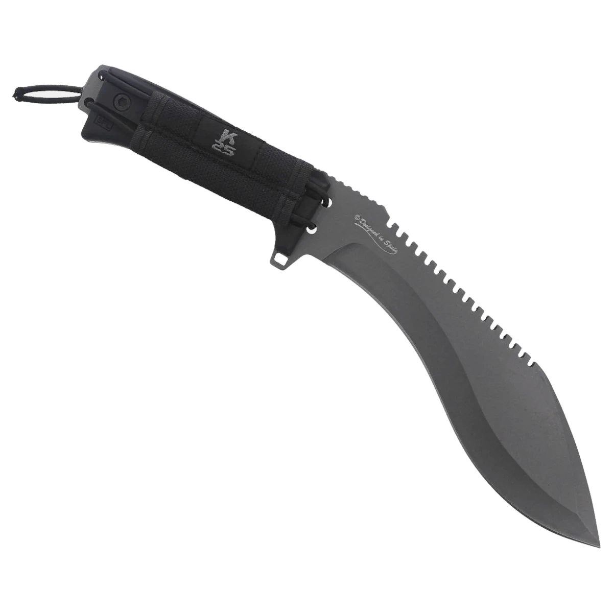 Głownia - profil kukri umożliwia zwiększenie siły cięcia przy zachowaniu dobrej kontroli nad ostrzem, co sprawia, że narzędzie doskonale nadaje się do rąbania gałęzi, przecinania gęstej roślinności oraz innych zadań terenowych. Ostrze zostało wykonane ze stali nierdzewnej 7Cr17MoV, odpornej na korozję i łatwej w konserwacji. Powłoka titanium zabezpiecza głownię przed zarysowaniami i wpływem wilgoci, a jej matowa struktura redukuje odbicia światła. Zastosowany szlif płaski pozwala na efektywne wnikanie ostrza w materiał, zachowując przy tym odpowiednią grubość dla zapewnienia trwałości. Konstrukcja typu full tang dodatkowo usztywnia całość, zwiększając bezpieczeństwo i niezawodność w czasie intensywnego użytkowania.