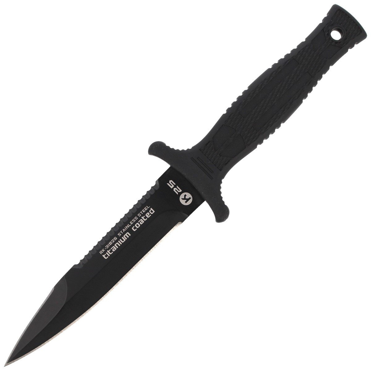 - Botero Black Rubber, Black Titanium – kompaktowy nóż boot z ostrzem typu dagger pokrytym powłoką Black Titanium i rękojeścią z antypoślizgowej czarnej gumy. Dyskretne, skuteczne narzędzie do szybkiego użycia w terenie i sytuacjach awaryjnych.