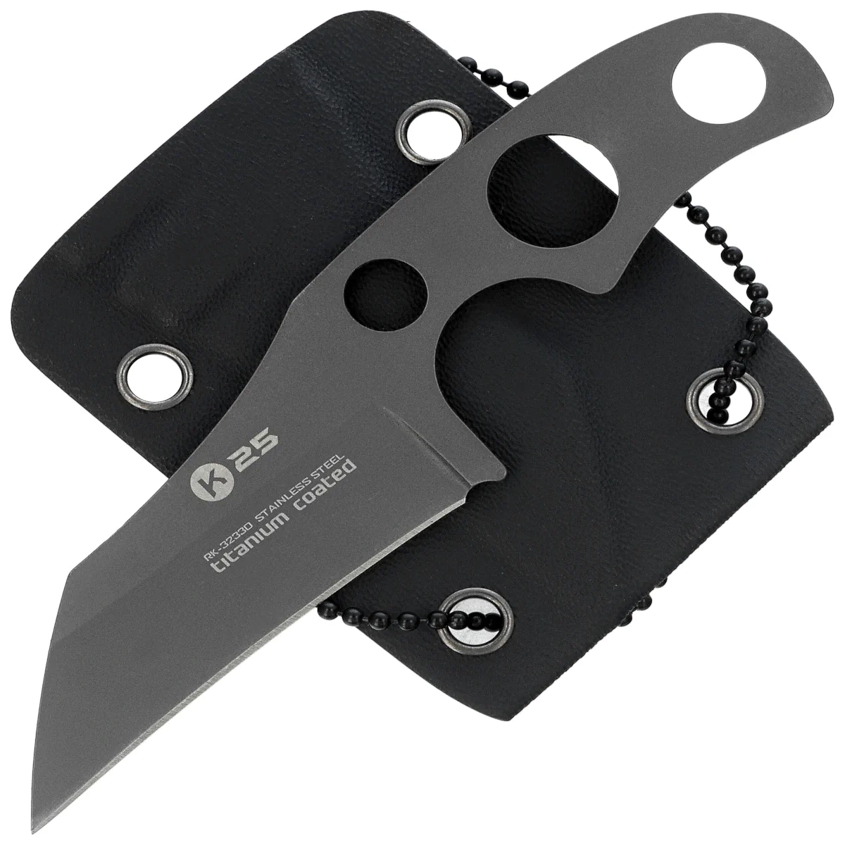 - RK-32330 Neck Knife Titanium – kompaktowy nóż na szyję z pełnostalową konstrukcją, ostrzem ze stali 7Cr17Mov pokrytym powłoką tytanową oraz pochwą Kydex z łańcuszkiem. Lekki i dyskretny, idealny do codziennego użytku EDC oraz zadań taktycznych.