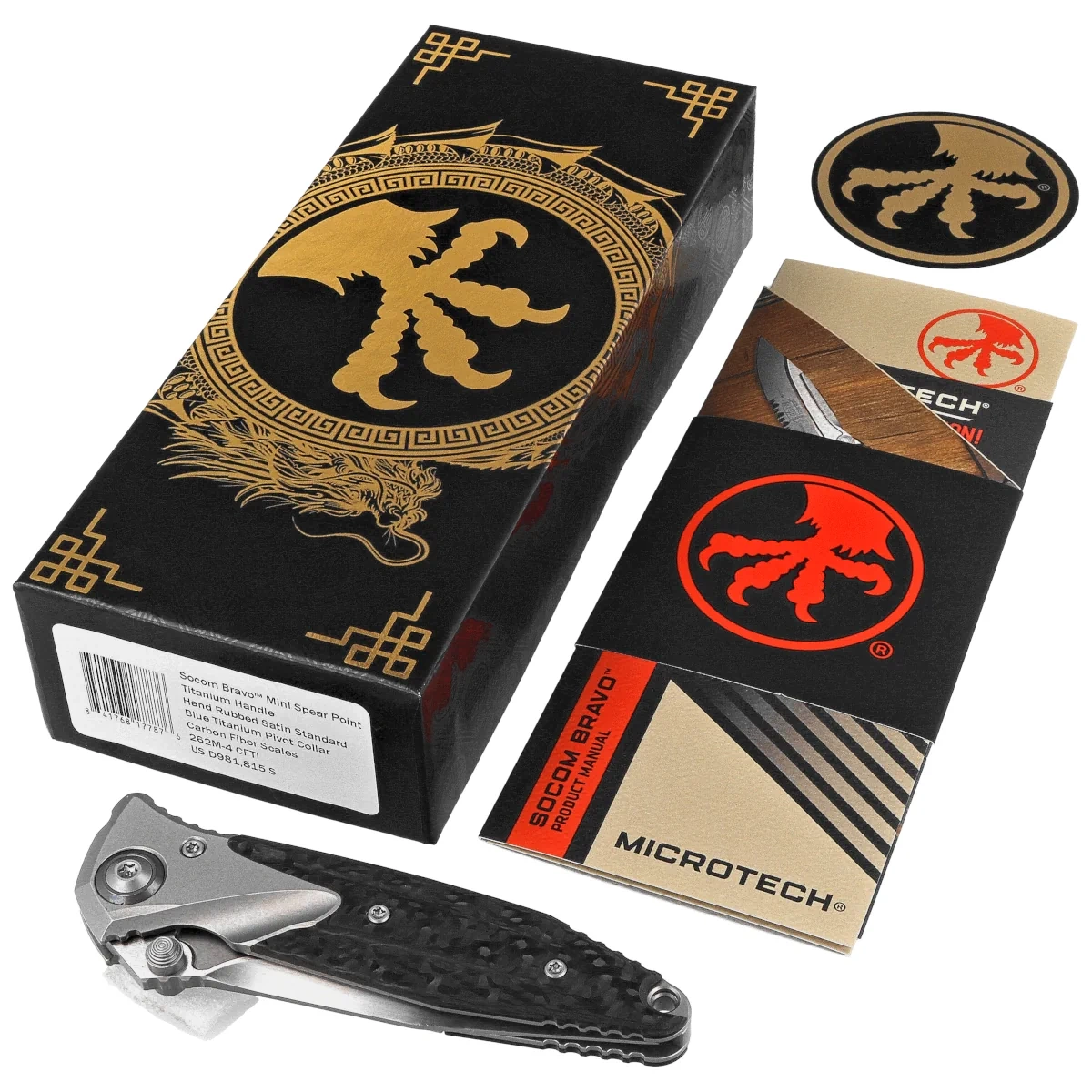 Nóż składany Microtech Socom Bravo Mini SP Titanium/Carbon Fiber, Blue HW, Hand Rubbed Satin M390 by Tony Marfione (262M-4CFTI)