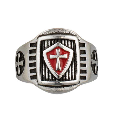 - Templar Shield Ring Ø21 (09981-21) – sygnet z emaliowaną tarczą templariuszy, czarnymi krzyżami maltańskimi i rytym wykończeniem. Wykonany z trwałego metalu w srebrnym kolorze, stanowi wyrazisty akcent dla pasjonatów historii i symboliki rycerskiej.