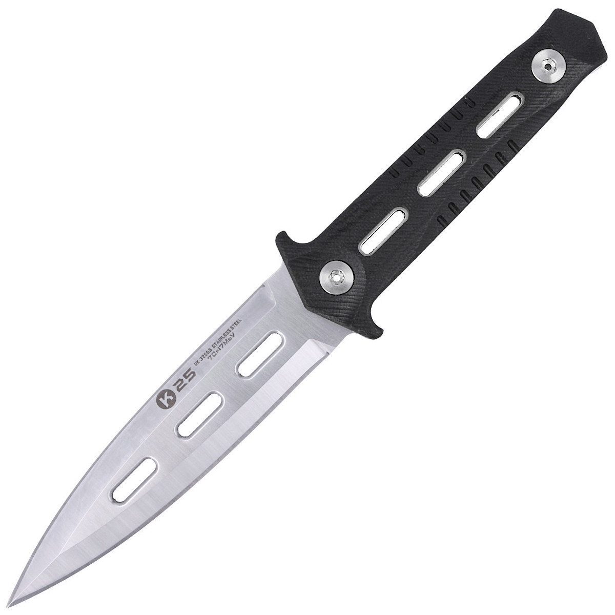 - Boot Knife Black G10, Satin – pełnowymiarowy nóż taktyczny typu dagger od K25 z głownią ze stali 7Cr17MoV wykończoną satynowaniem i rękojeścią z wytrzymałego kompozytu G10. Wyposażony w pochwę z systemem Quick Release.