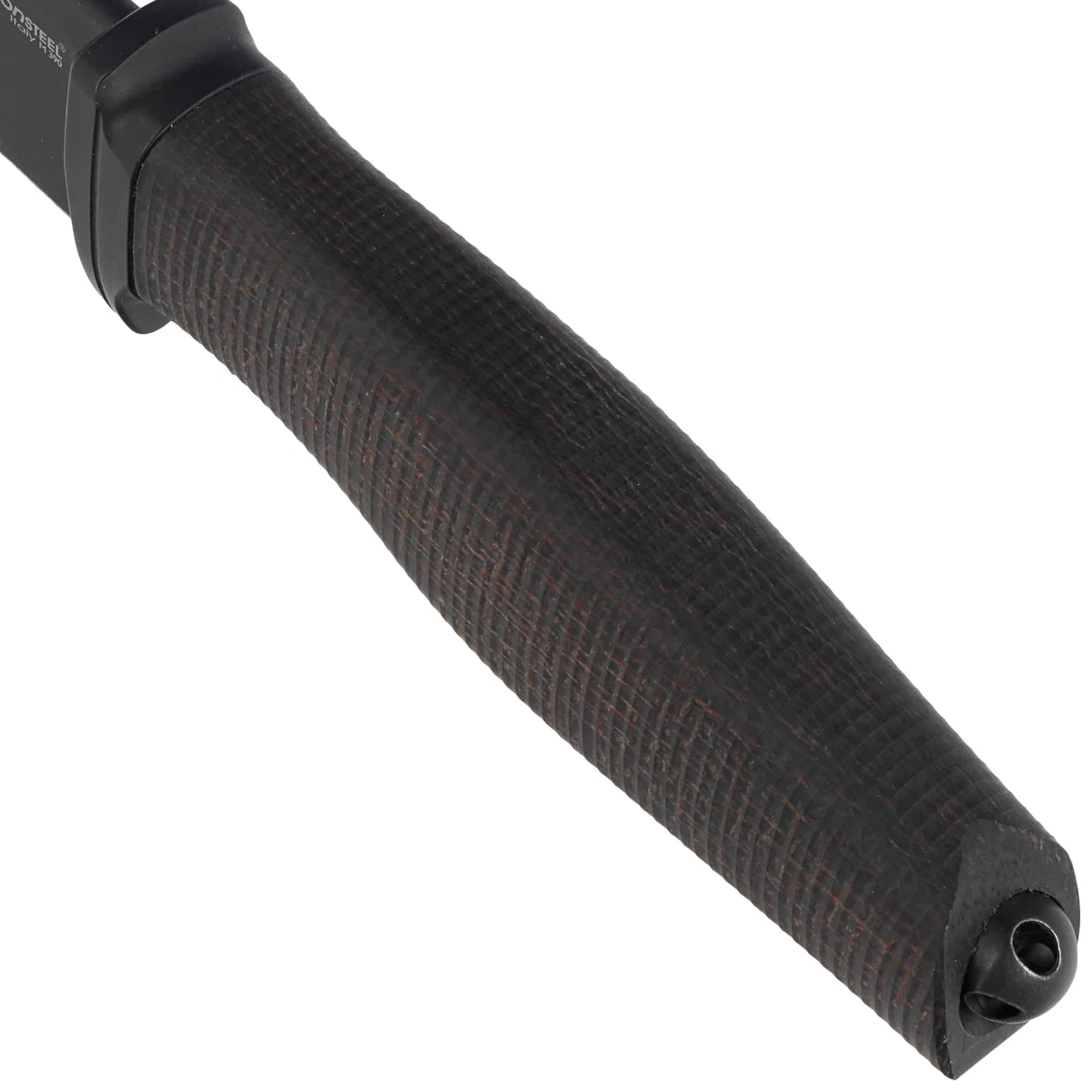 Pochwa - przedłużana, chroniąca głownię wraz z częścią rękojeści. Ręcznie szyta, wykonana z naturalnej skóry w kolorze czarnym z tłoczonym logo producenta. Brzegi kabury przeszyto ozdobnym podwójnym szwem. Zapinana na zatrzask typu Prym. Mocowanie do pasa lub oporządzenia umożliwia przenoszenie noża w pozycji pionowej.