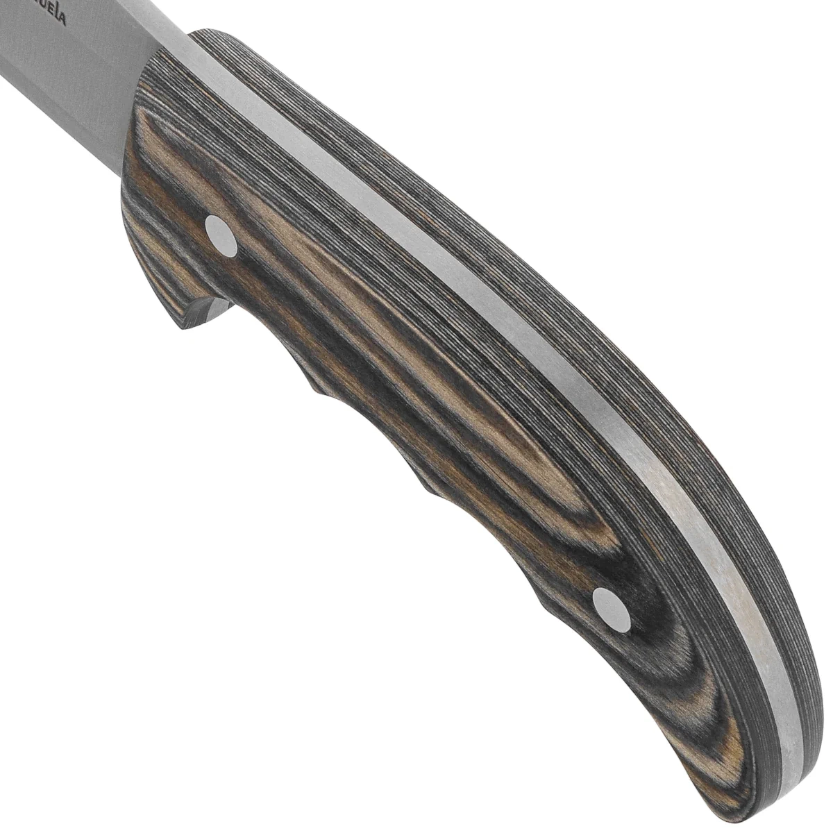Muela Outdoor-12M to pełnowartościowy nóż outdoorowy, który łączy tradycyjne rzemiosło z nowoczesnym podejściem do materiałów i użytkowości. Zaprojektowany z myślą o praktycznych zadaniach terenowych, sprawdzi się zarówno w trakcie polowania, jak i codziennych aktywności bushcraftowych. Konstrukcja typu full tang gwarantuje stabilność i odporność na przeciążenia, czyniąc model Outdoor-12M godnym zaufania narzędziem w wymagających warunkach. Głownia wykonana ze stali nierdzewnej X50CrMoV15 oferuje optymalną równowagę między odpornością na korozję, wytrzymałością i łatwością ostrzenia. Subtelne satin finish dodaje jej elegancji, a funkcjonalna geometria pozwala na efektywne cięcie, skrobanie i przebijanie. Rękojeść z laminatu drewna Pakka wnosi element klasy i naturalnego ciepła, zapewniając jednocześnie komfortowy chwyt nawet przy dłuższej pracy. Model uzupełnia ręcznie szyta pochwa ze skóry wołowej, przystosowana do noszenia przy pasie. To narzędzie dla osób, które szukają noża o wyważonym charakterze – praktycznego, niezawodnego i estetycznego zarazem.