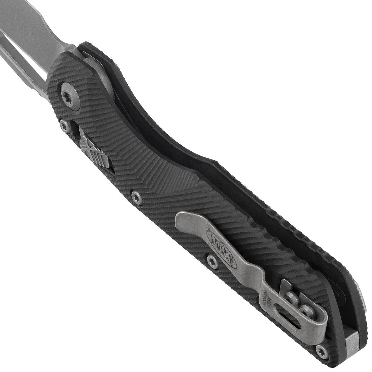 Rękojeść - wykonana z najwyższą precyzją na frezarkach CNC z kompozytu G10. Dla poprawy chwytu powierzchnię rękojeści pokryto głęboko frezowaną, strukturą 3D Fluted, która zapewnia pewny i stabilny chwyt. Szeroki suwak blokady z charakterystyczną dla Microtechu schodkową fakturą (X Button) gwarantuje pewną i komfortową obsługę. Okładziny połączono solidnym, aluminiowym backspacerem. Dwustronny (prawa/lewa) klips umożliwia dyskretne przenoszenie noża w pozycji tip-up. Nad klipsem znajduje się lanyard hole, czyli otwór na linkę zabezpieczającą lub ozdobną.