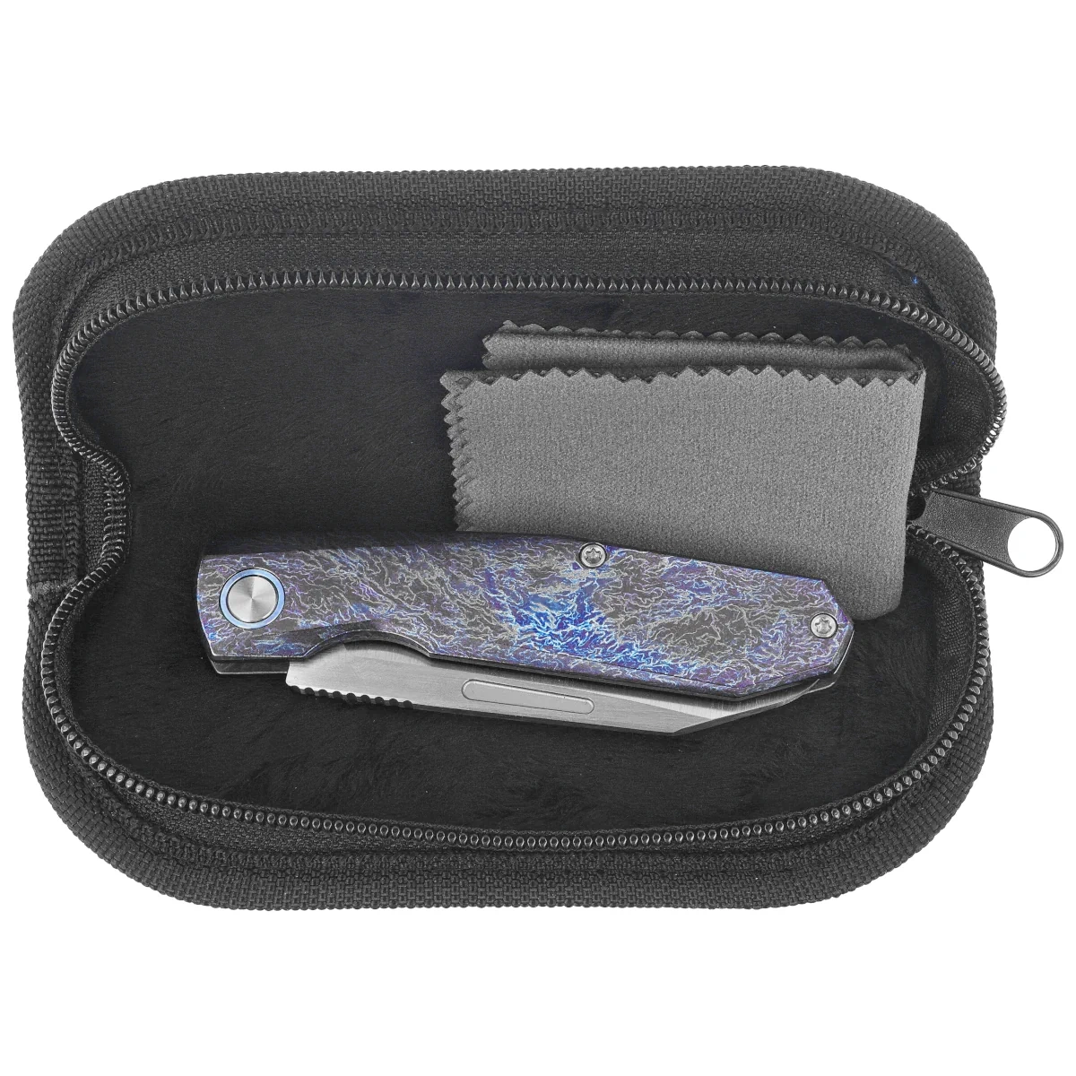 Rękojeść - wyfrezowana z tytanu 6AL4V, kolorowane termicznie wzorem Thunder Lightning. Konstrukcja o profilu open back pozwala na łatwą konserwację oraz zmniejszenie masy całkowitej. Ergonomiczne wyprofilowanie pod palec wskazujący oraz smukła geometria zapewniają komfort i precyzję chwytu. Symetryczny, obustronny klips deep carry umożliwia niskoprofilowe przenoszenie noża w kieszeni bez ingerencji w stylistykę konstrukcji. Akcenty takie jak anodyzowany pierścień pivotu podkreślają nowoczesny, surowy charakter projektu, w którym funkcjonalność idzie w parze z minimalistycznym wzornictwem.