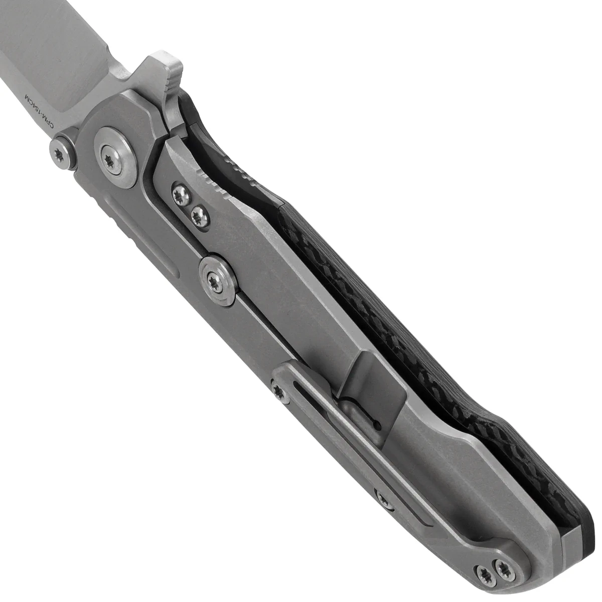 Rękojeść - strona prezentacyjna z kompozytu Carbon Fiber, strona blokady z tytanu, wykończona metodą Dark Bead Blasted, gwarantuje sztywność, lekkość i wysoką odporność na zużycie. Frezowane podcięcia pod palce i fazowane krawędzie poprawiają ergonomię, a backspacer z tytanu wzmacnia strukturę oraz pozwala na zamocowanie linki. Klips deep carry umożliwia dyskretne przenoszenie, a blokada frame lock ze stalową wkładką dba o bezpieczeństwo użytkowania. Akcenty w postaci anodowanych na niebiesko śrub i pivotu podkreślają futurystyczny charakter projektu i wyróżniają ten model na tle innych noży taktycznych.