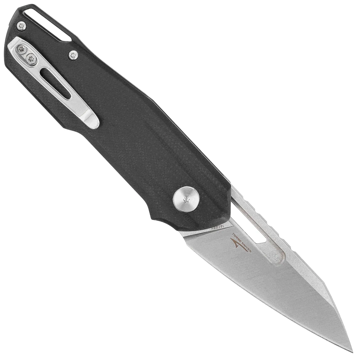 Rękojeść - zaprojektowana z myślą o pełnej kontroli i komforcie użytkowania przy zachowaniu kompaktowych rozmiarów. Okładziny z kompozytu G10 o lekkiej fakturze i matowym wykończeniu zapewniają pewny chwyt, nawet w wilgotnym środowisku. Ergonomiczne wyprofilowanie z wyraźnym podcięciem na palec wskazujący poprawia stabilność pracy przy precyzyjnych zadaniach. Na grzbiecie znajduje się frezowanie (jimping), które dodatkowo zwiększa przyczepność kciuka. Wewnętrzne stalowe linery wzmacniają całą konstrukcję i są integralną częścią systemu blokady liner lock, który pewnie utrzymuje głownię w pozycji otwartej. Klips deep carry pozwala na dyskretne przenoszenie noża w kieszeni, a otwór w tylnej części rękojeści umożliwia montaż linki zabezpieczającej. Całość uzupełnia dekoracyjny pivot z graficznym detalem – znakiem firmowym projektanta.