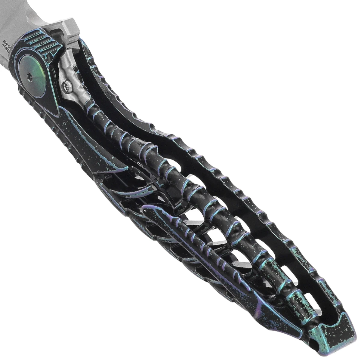 Rękojeść - z jednolitego kawałka tytanu, który poddano frezowaniu CNC, tworząc lekką i sztywną strukturę o wyraźnie szkieletowej formie. Wzory nawiązujące do układów biomechanicznych oraz kontrastowe anodowanie w odcieniach czerni i zieleni nadają nożowi dynamiczny charakter. Profilowanie pod palce, frezowania na grzbiecie oraz pierścieniowy pivot wzmacniają wrażenia użytkowe i estetyczne. Konstrukcja została uzupełniona o klips deep carry oraz otwór na smycz, co czyni ten model funkcjonalnym także w codziennym zastosowaniu. Nóż Thor6 to dzieło sztuki użytkowej – przeznaczone dla osób ceniących najwyższą jakość wykonania i wyjątkową formę.