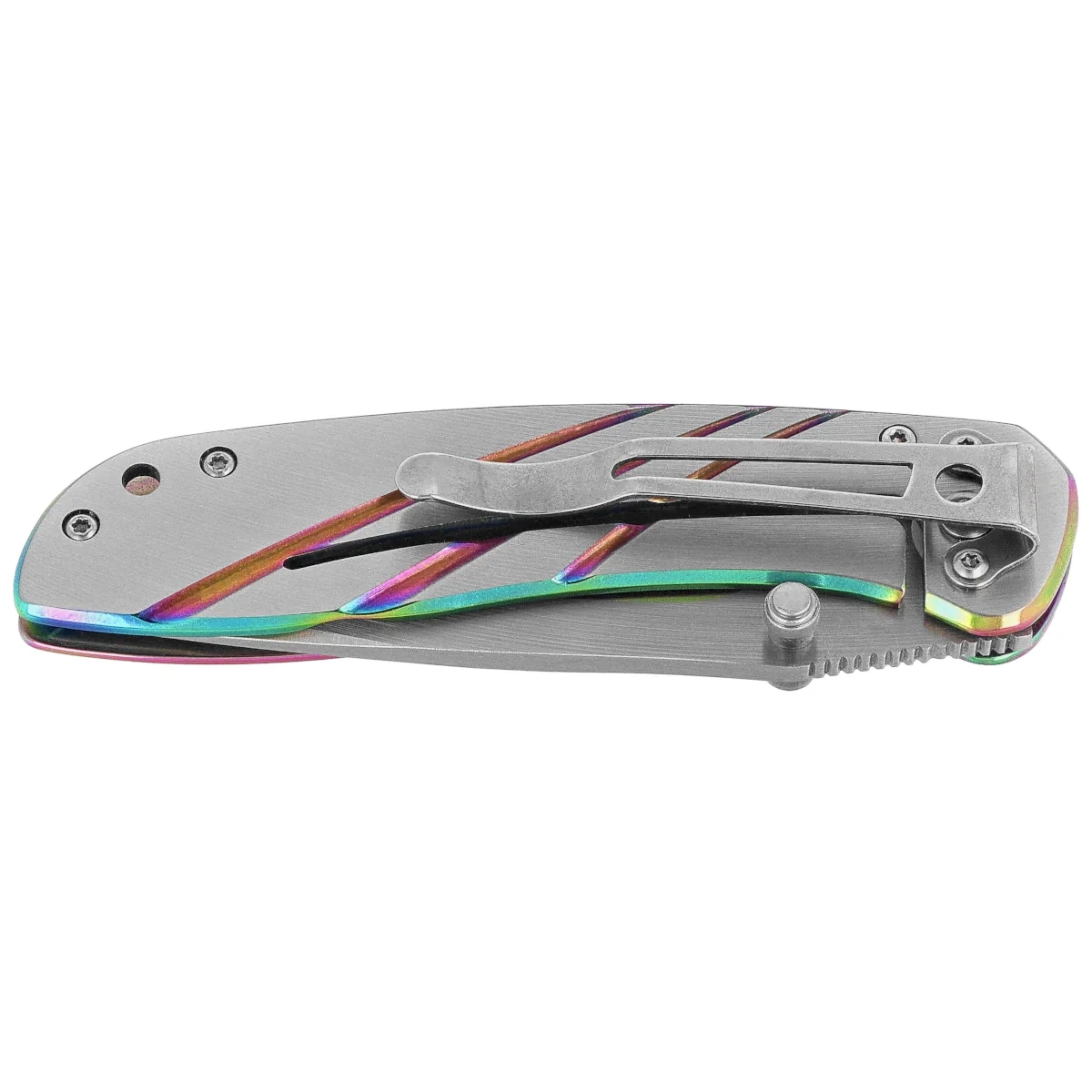 Rękojeść - pokryta powłoką Titanium Coated wyróżnia się efektem tęczowej irydyzacji, który nadaje nożowi futurystyczny wygląd. Profilowane nacięcia w powierzchni pełnią funkcję antypoślizgową, poprawiając kontrolę nad narzędziem podczas pracy. Klips mocujący umożliwia szybki i stabilny montaż przy pasku lub krawędzi kieszeni, zwiększając funkcjonalność na co dzień. Sama konstrukcja rękojeści jest odporna na zużycie mechaniczne, a jej forma została dopracowana tak, by zapewniać ergonomię i komfort także podczas dłuższego użytkowania. To propozycja dla osób, które w nożu szukają nie tylko narzędzia, ale i wyróżniającego się elementu stylizacji.