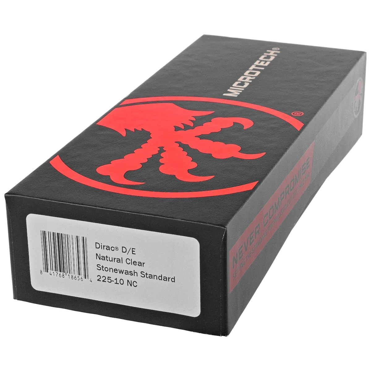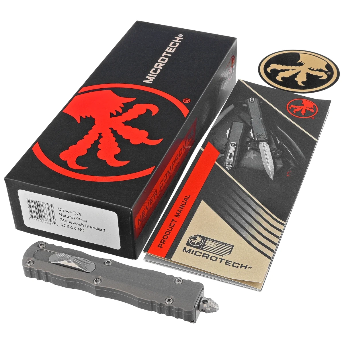 - Dirac D/E Natural Clear Aluminium Stonewashed kompaktowy nóż automatyczny OTF działający w trybie D/A. Wyposażony w piekielnie szybki mechanizm wysuwania ostrza. Przycisk slider z boku rękojeści dla wygody obsługi. Projekt Tony Marfione z Microtech Knives