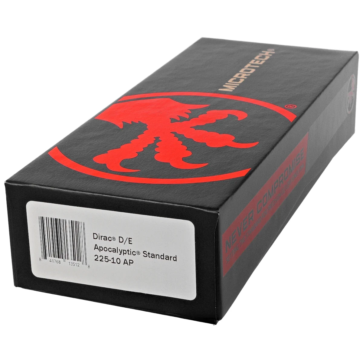 Dirac D/E Black Aluminium, Apocalyptic to kompaktowy nóż automatyczny OTF z serii Dirac. Pracujący w trybie D/A, wyposażony w piekielnie szybki mechanizm wysuwający ostrze. Przycisk slidera na boku rękojeści. W 100% wyprodukowany i zmontowany w USA. Projekt Anthony'ego Marfione, knifemakera i właściciela Microtech Knives.