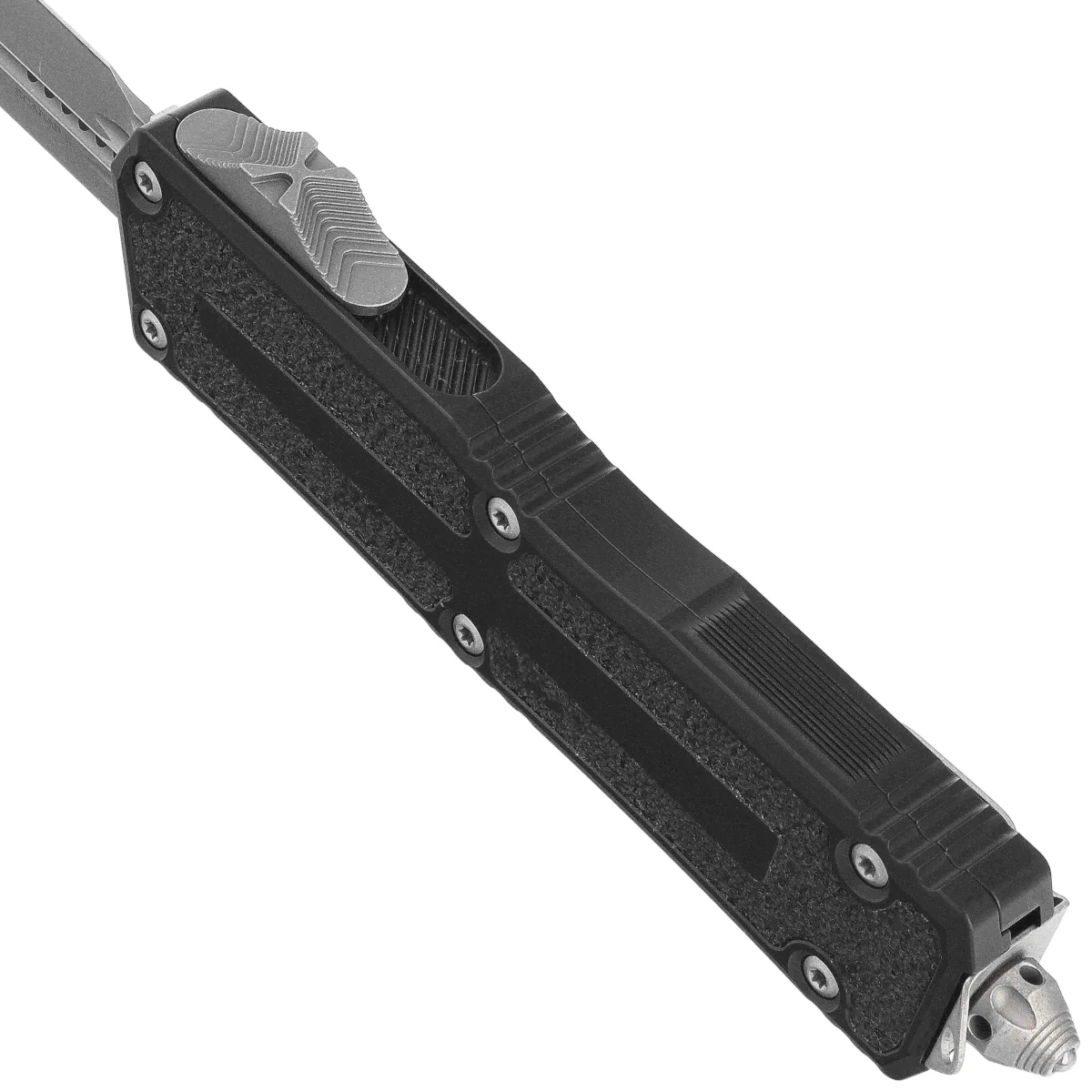 Głownia - szlifowana maszynowo D/E-S (Double Edge-SpearPoint), obustronnie ostrzona z linią rowków zbrocza po obu stronach ostrza. Wykończona maskującym drobne rysy powstałe podczas użytkowania patynowaniem Apocalyptic. Ostrze wyprowadzono wysokim szlifem płaskim (Flat Grind), zapewniającym doskonałe właściwości tnące. Dzięki temu przy zachowaniu dużej wytrzymałości nóż ma znakomite właściwości przy przebijaniu. Mocny mechanizm wysuwania / chowania klingi za pomocą moletowanego Thumb Slide, schodkowego suwaka pod kciuk wymaga dla bezpieczeństwa przyłożenia konkretnej siły do pokonania oporu sprężyny. W tym modelu moletowanie zostało ulepszone do wersji z charakterystycznym "X" w centrum. Sposób otwierania zapewnia bezproblemowe otwarcie osobom prawo, jak i leworęcznym.