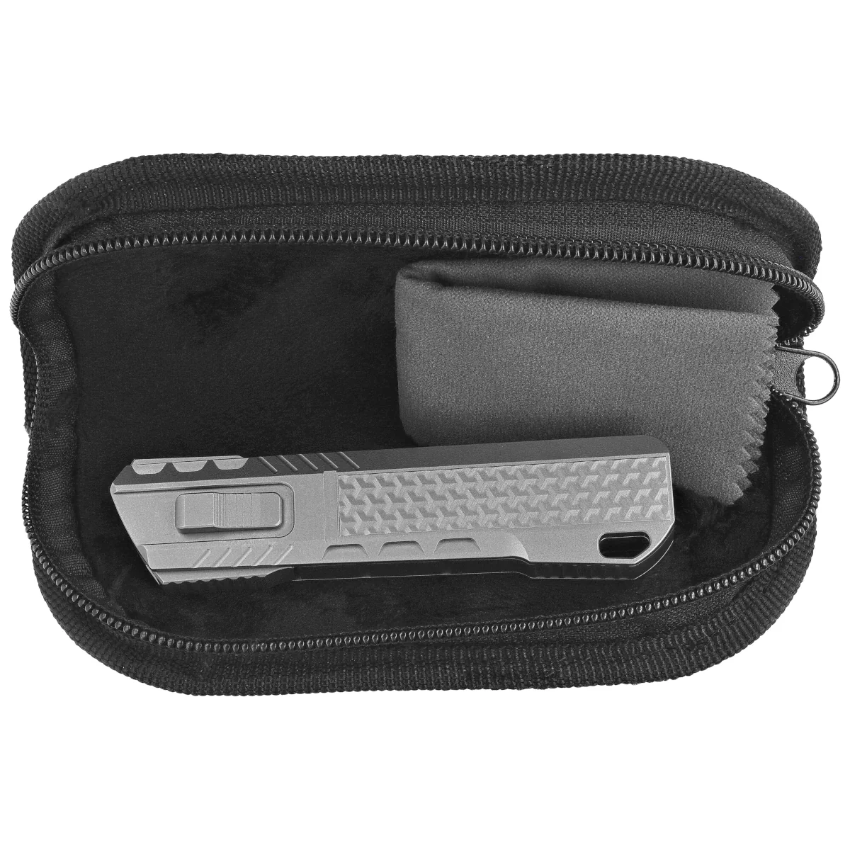 Rękojeść - wykonana na frezarkach CNC z tytanu, z trójwymiarową teksturą. Fazowane krawędzie okładek eliminują ostre ranty oraz poprawiają pewność uchwytu. Wkładka z kompozytu Carbon Fiber daje wizualny kontrast i poprawia uchwyt. Po prawej stronie kunsztowny suwak do wysuwania/wsuwania klingi. Jednopozycyjny tytanowy (prawa) klips deep carry umożliwia dyskretne przenoszenie noża w kieszeni w pozycji tip-down (czubkiem ostrza do dołu).