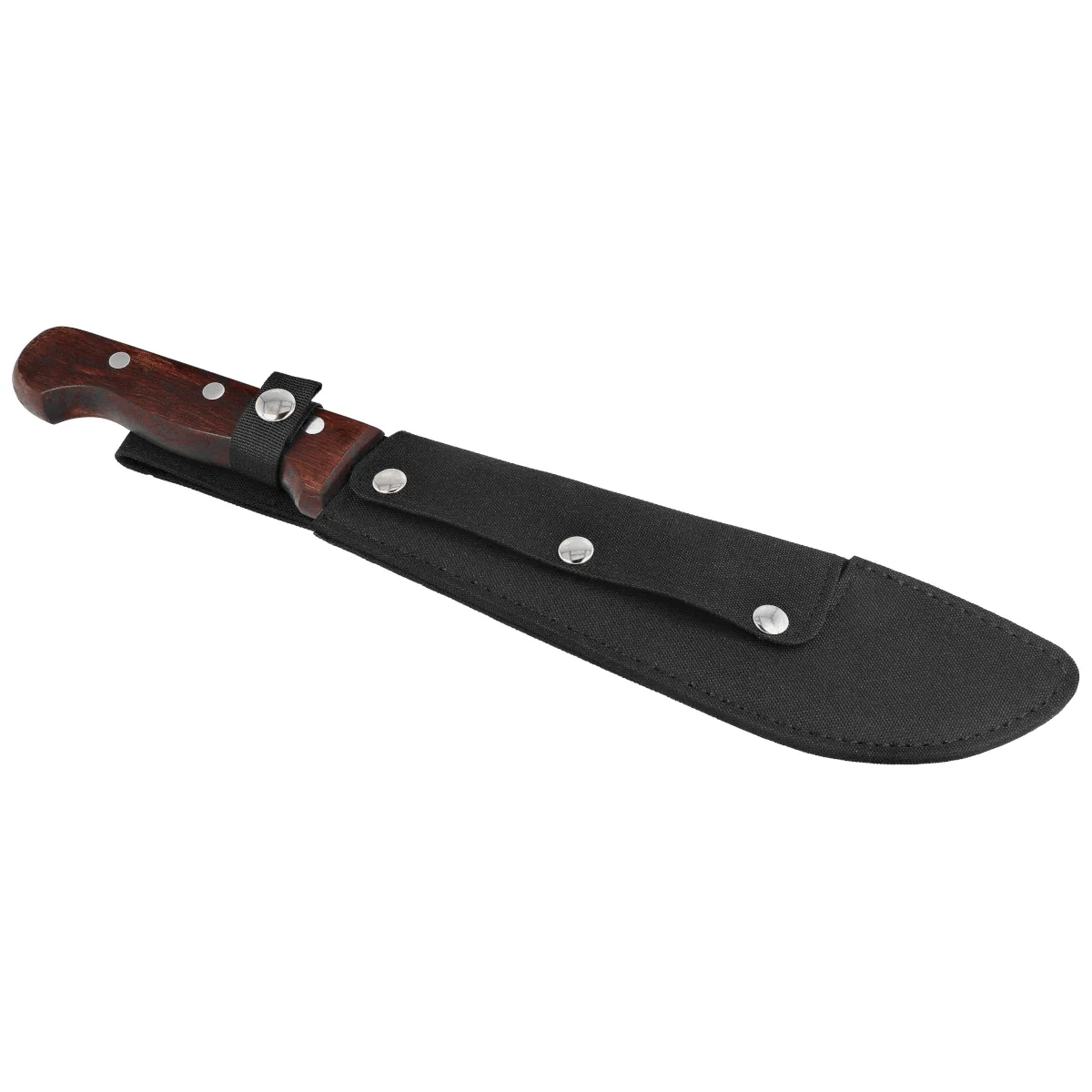 Rękojeść - z ciemnego, naturalnego drewna, łączącego klasyczny wygląd z dobrą ergonomią. Anatomiczne profilowanie uchwytu pozwala na wygodne operowanie narzędziem przez dłuższy czas, ograniczając zmęczenie dłoni. Stabilne mocowanie nitami do trzpienia typu full tang przekłada się na trwałość całości i odporność na przeciążenia. Z tyłu zastosowano delikatne poszerzenie, które poprawia bezpieczeństwo i zapobiega przypadkowemu wyślizgnięciu się maczety w trakcie pracy. Dołączona pochwa z nylonu umożliwia wygodne przenoszenie i przechowywanie narzędzia, zwiększając jego funkcjonalność w warunkach terenowych.