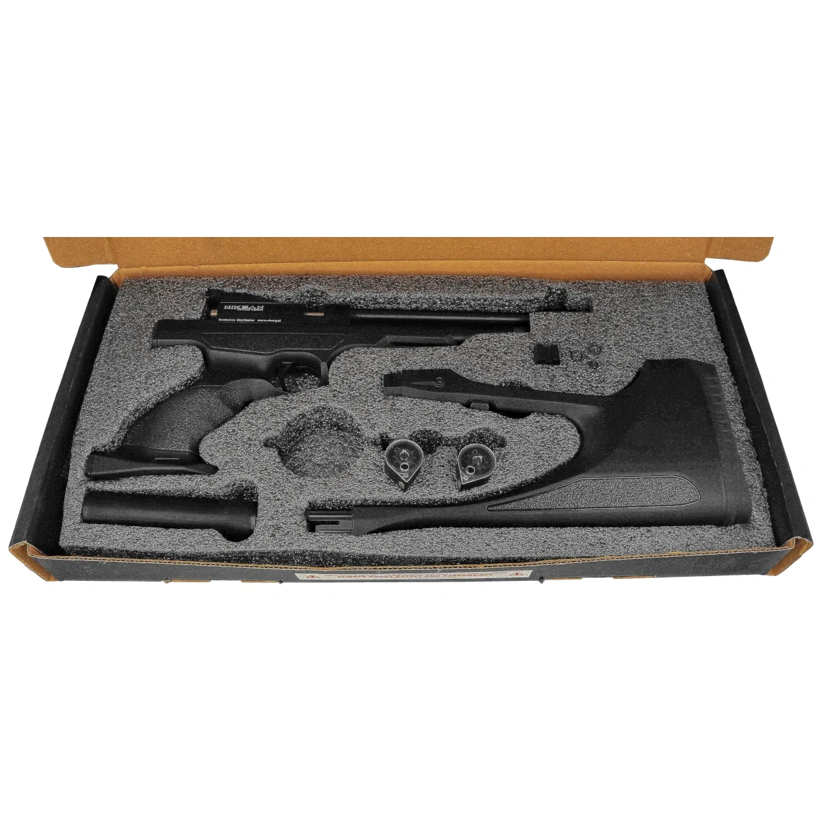 Magazynek – obrotowy o pojemności od 7 do 9 śrucin, w zależności od kalibru. Przeładowanie odbywa się za pomocą dźwigni napinania typu bolt action, która naciąga zbijak, obraca magazynek i wprowadza nowy śrut do komory identycznie jak w wiatrówkach PCP. W zestawie znajdują się dwa magazynki, co zapewnia wygodę i ciągłość strzelania. Idealne rozwiązanie dla strzelców szukających funkcjonalności i wygody w użytkowaniu swojej wiatrówki.