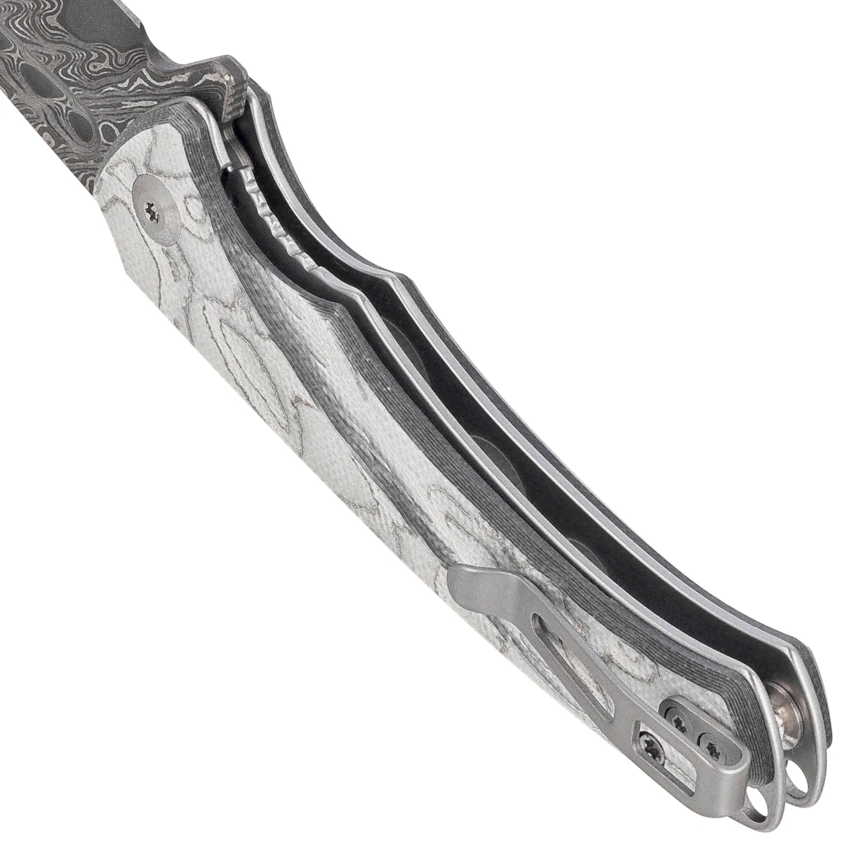 Głownia - typu drop point została wykonana z wytrzymałego nierdzewnego damastu, oferującego dobrą retencję ostrości, odporność na rdzę oraz łatwość ostrzenia. Szlif wklęsły zapewnia precyzyjne prowadzenie ostrza, a trawienie acid etched podkreśla linię wzorów stali. Otwieranie odbywa się za pomocą flippera, który w połączeniu z łożyskami ceramicznymi gwarantuje aksamitnie płynny ruch ostrza – bez oporu, bez hałasu, z natychmiastową gotowością do działania.