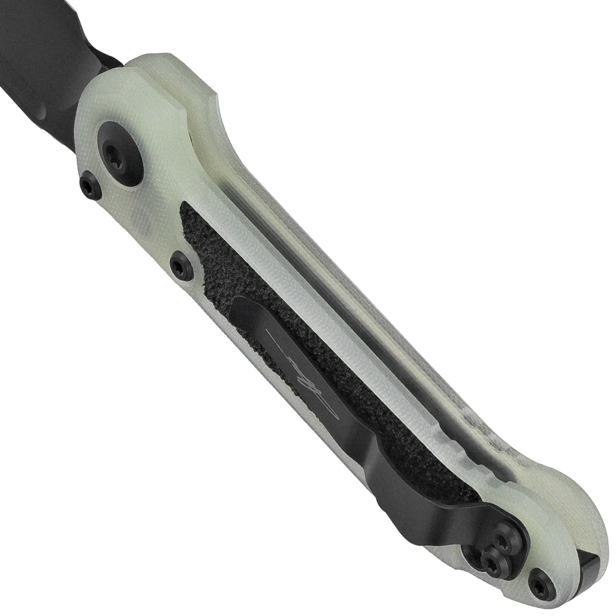 Rękojeść - wykonana z doskonałą precyzją w technologii 3D na frezarkach CNC, z kompozytu G10. Perfekcyjnie spasowane wkładki (inlay) ze specjalnego materiału 3M Traction Tape o fakturze papieru ściernego powodują, że nóż nie ślizga się w dłoni podczas używania. Solidny backspacer do którego przymocowano okładziny gwarantuje sztywność i wytrzymałość całej konstrukcji. Na rękojeści znajdują się nacięcia (jimping) dla pewniejszego chwytu. Ergonomiczny profil oraz jednopozycyjny (prawa) masywny klips, umożliwiają dyskretne przenoszenie noża w kieszeni, w pozycji tip-down (czubkiem ostrza do dołu). W tylnej części znajduje się lanyard hole, miejsce na linkę zabezpieczająca lub ozdobną.