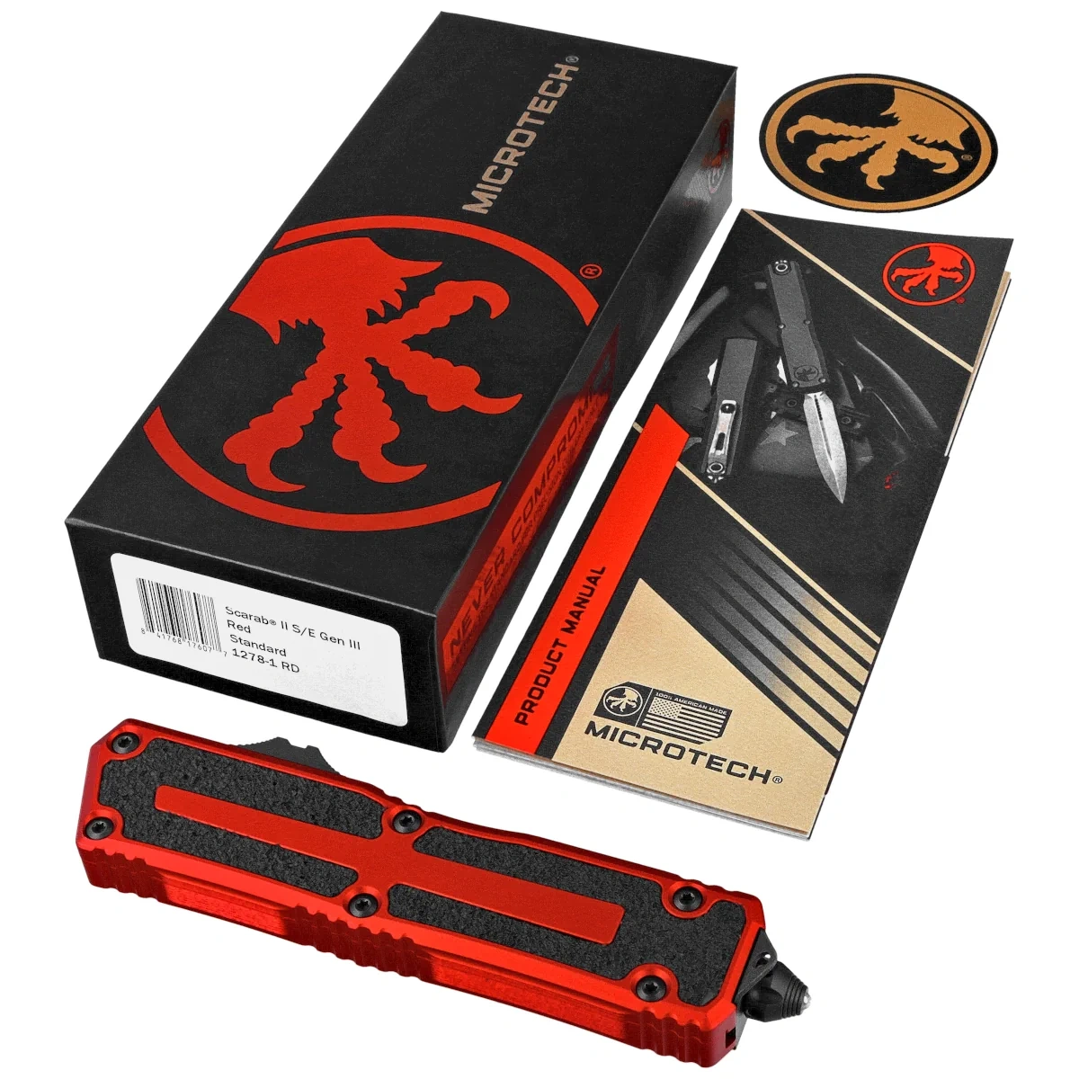 Scarab II Gen III S/E Red Aluminium, Black to szczyt doskonałości w dziedzinie automatycznych noży taktycznych, czerpiący inspirację z oryginalnego projektu Microtech Ultratech. Zbudowany, aby wytrzymać najtrudniejsze warunki, nowy Scarab II jest najlepszym wyborem do intensywnego użytkowania. Zachowując cechy stylistyczne swojego poprzednika, wyznacza nowy standard dla technologii OTF (Out The Front).